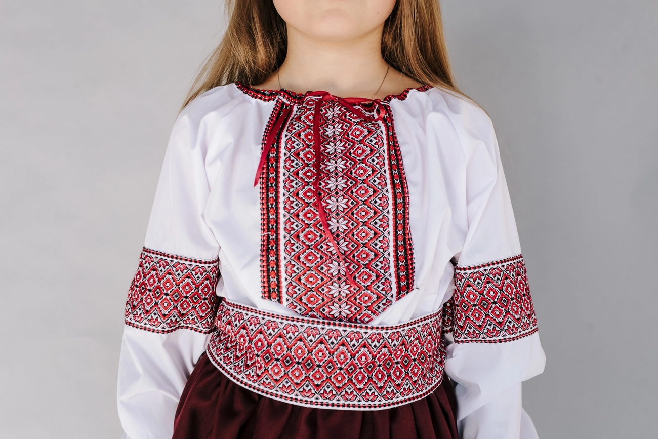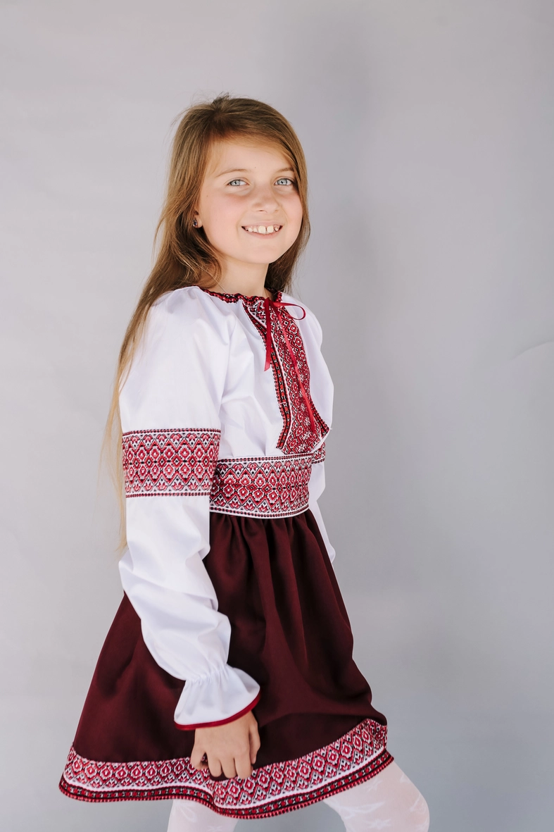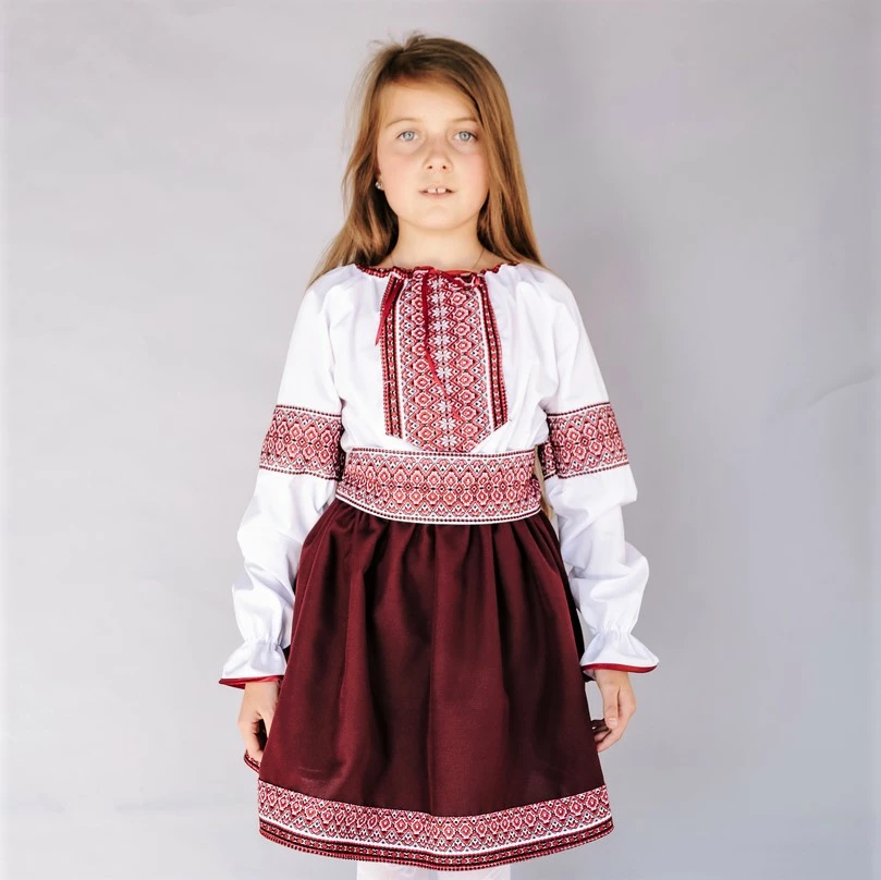 Дитячий вишитий костюм яскравого кольору із оригінальною бордовою спідничкою та вишивкою від гуртівні Leosouvenir створить неперевершений вигляд Вашої дитини.