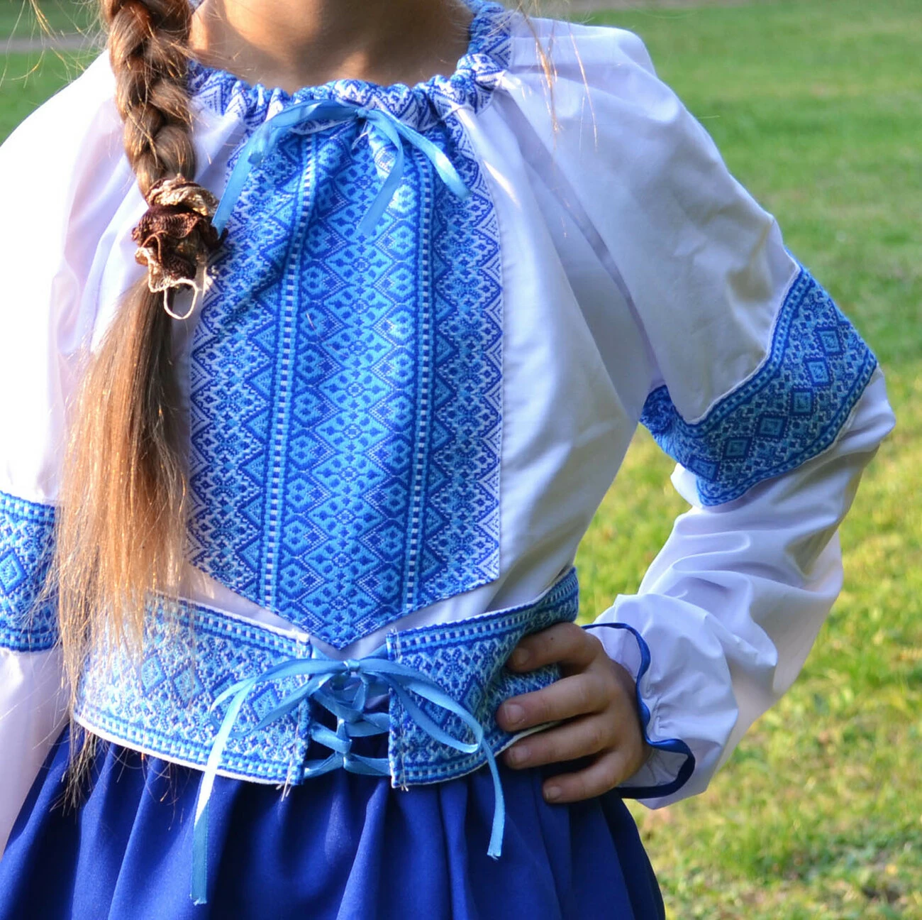 Дитячий вишитий костюм яскравого кольору із оригінальною синьою спідничкою та вишивкою від гуртівні Leosouvenir створить неперевершений вигляд Вашої дитини.
