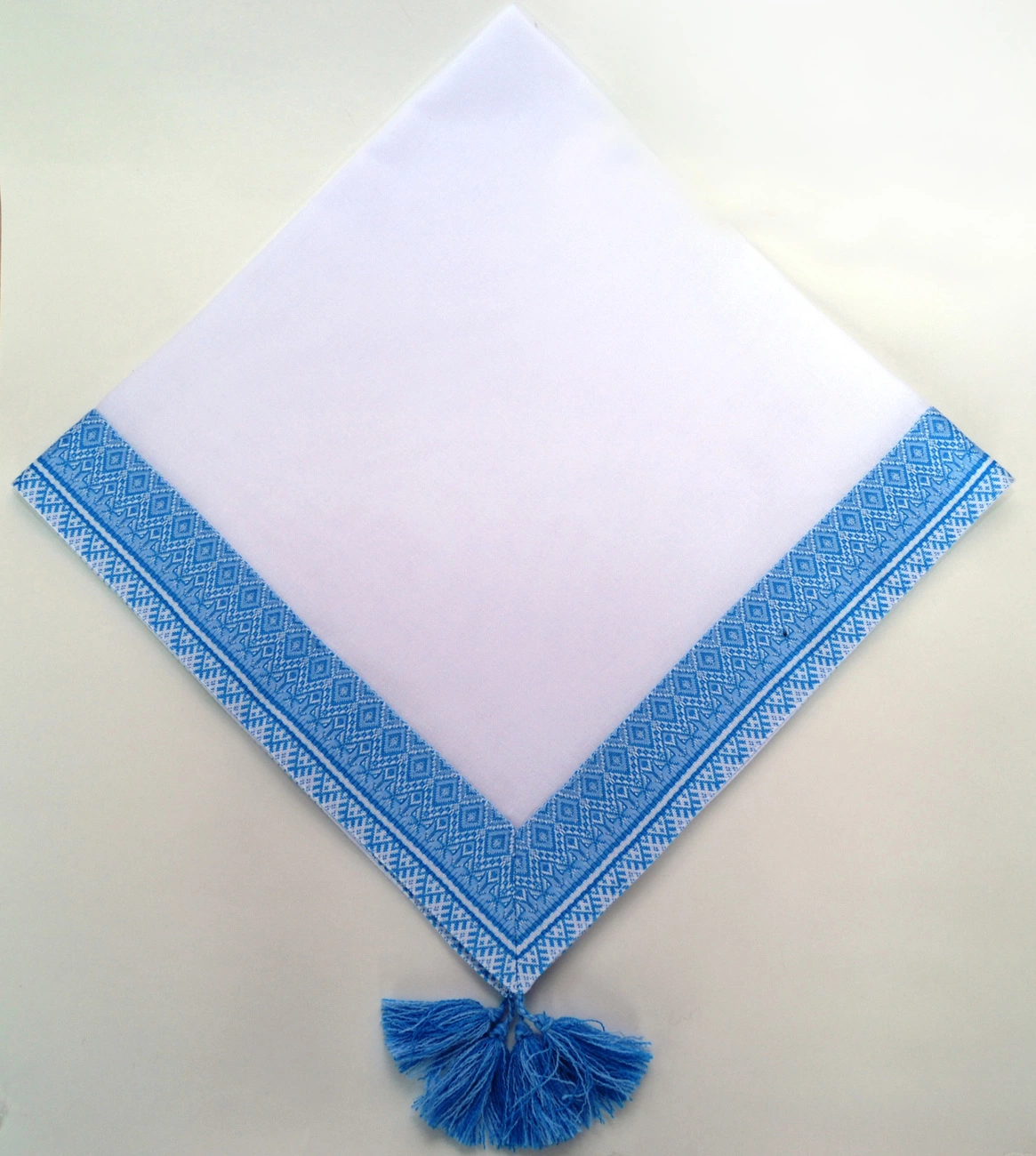Крижмо для хрещення квадратної форми, навколо обшите вишивкою блакитного кольору, від гуртівні Leosouvenir зробить вигляд Вашої малечі святковим і неповторним.