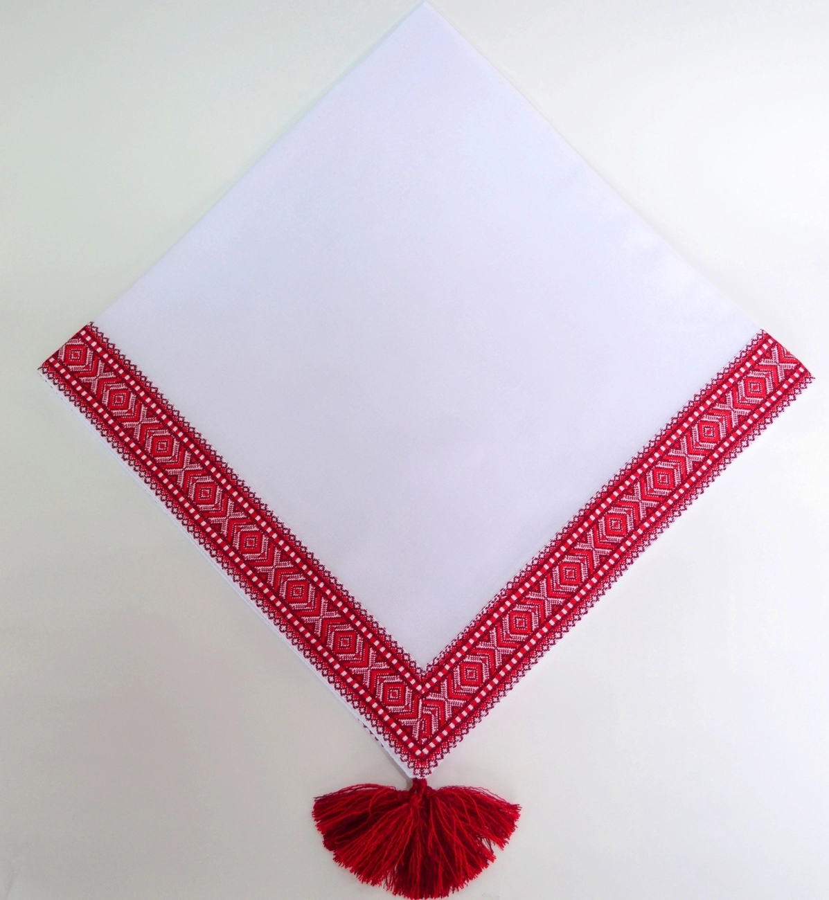 Крижмо для хрещення квадратної форми, навколо обшите вишивкою червоного кольору, від гуртівні Leosouvenir зробить вигляд Вашої малечі святковим і неповторним.