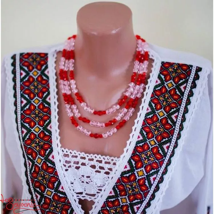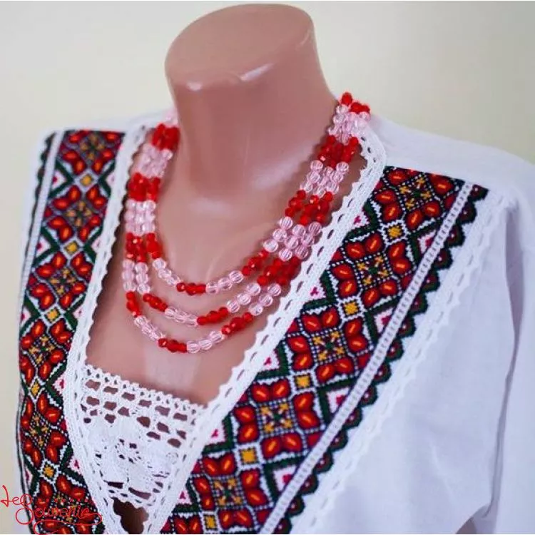 Рожеві коралі 3-ка від гуртівні Leosouvenir – це намисто з напівпрозорого скла, невеликої форми, ажурне і легке, красиво і вишукано виглядає на тлі української вишиванки.