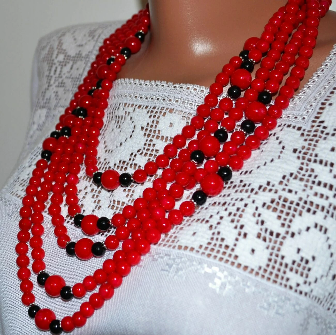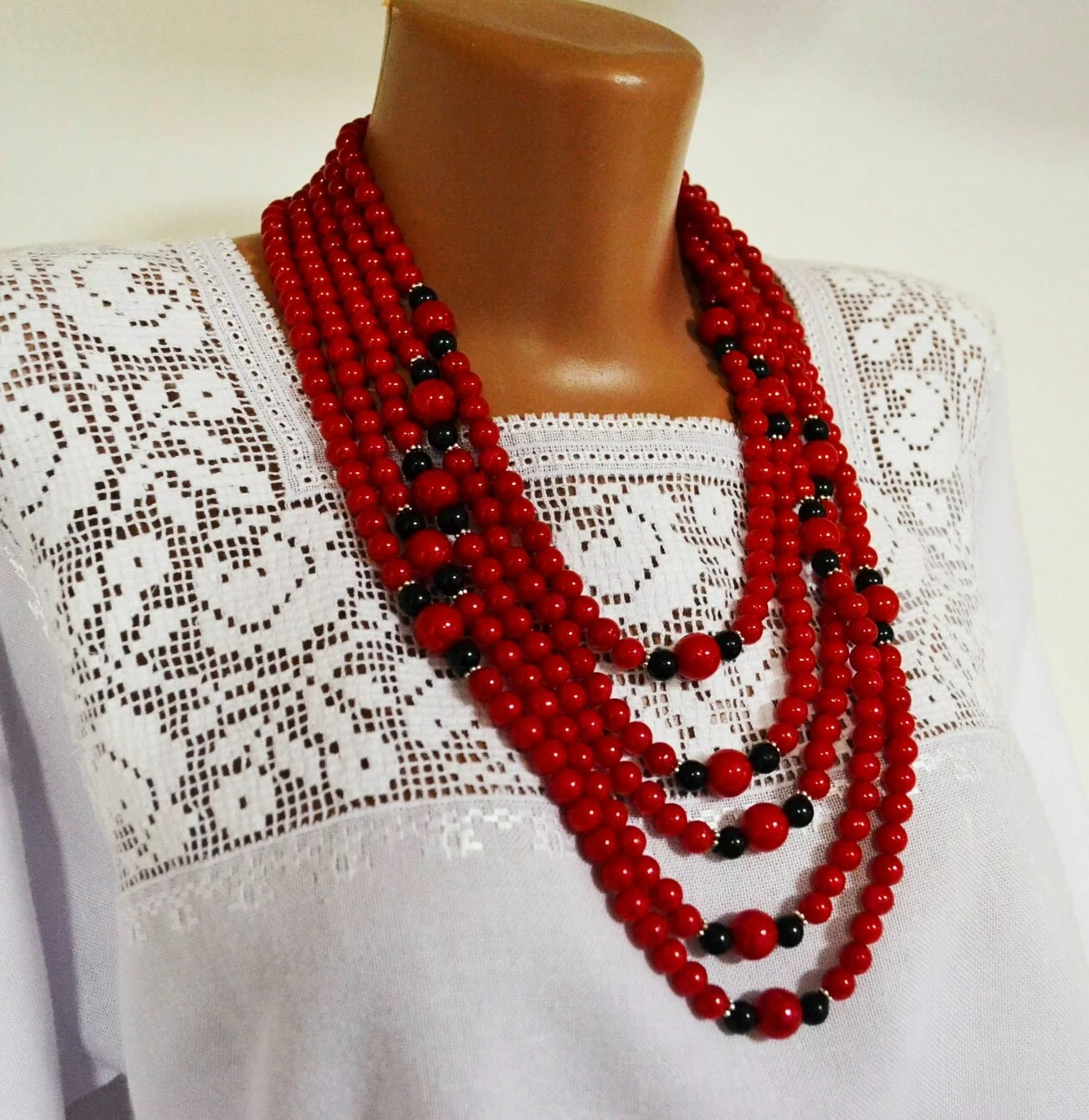 Червоні буси з чорними намистинками 5-ка від гуртівні Leosouvenir – це красиво і вишукано на тлі української вишиванки.