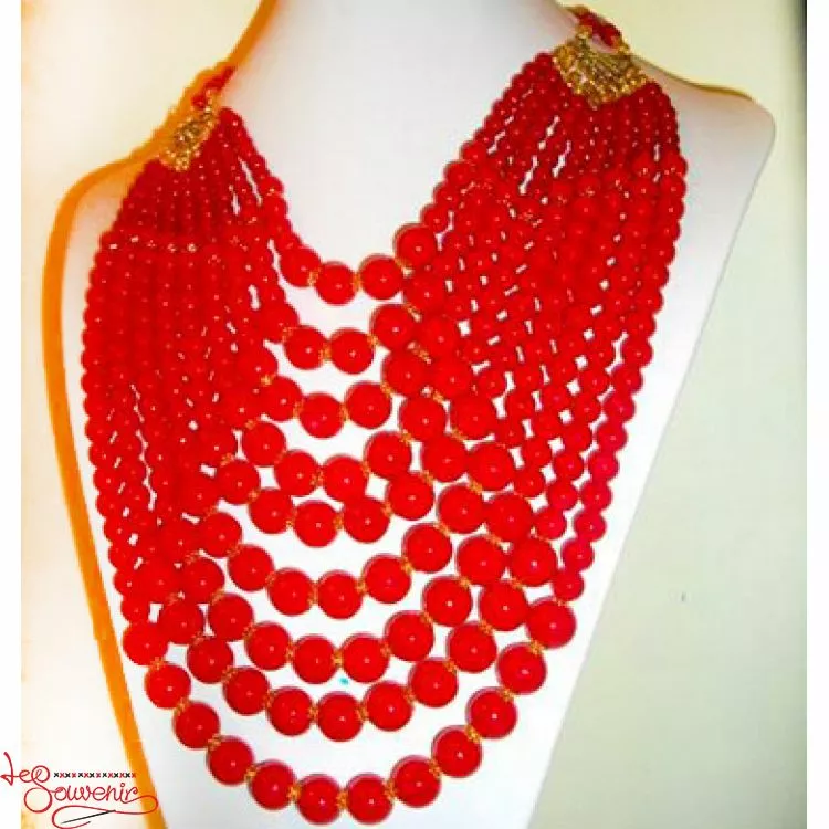 Червоні буси 9-ка з золотистими намистинками від гуртівні Leosouvenir – це красиво і вишукано на тлі української вишиванки.