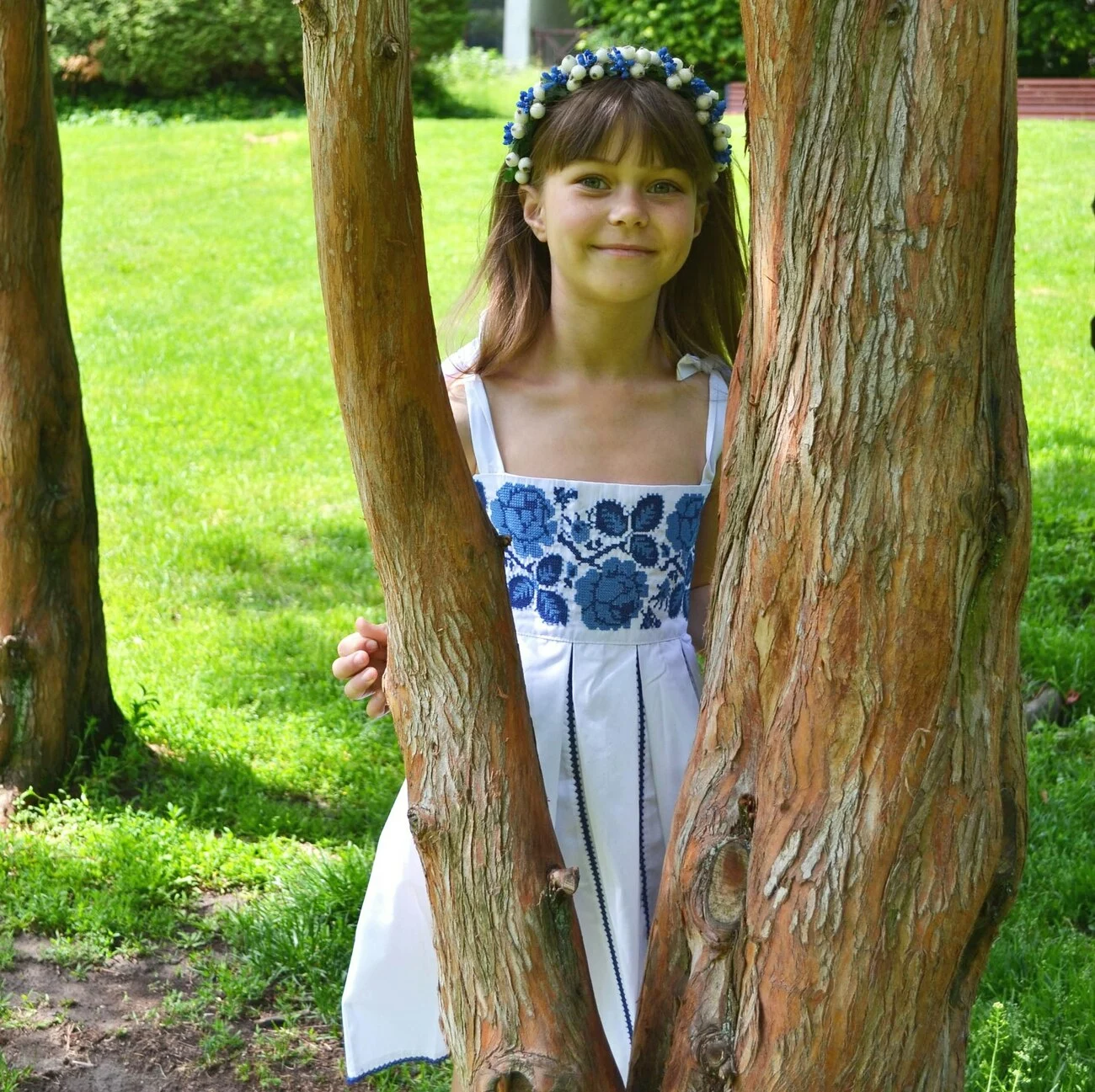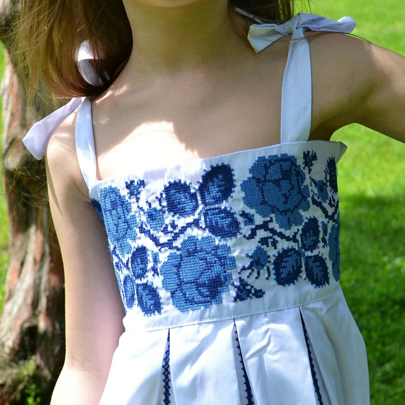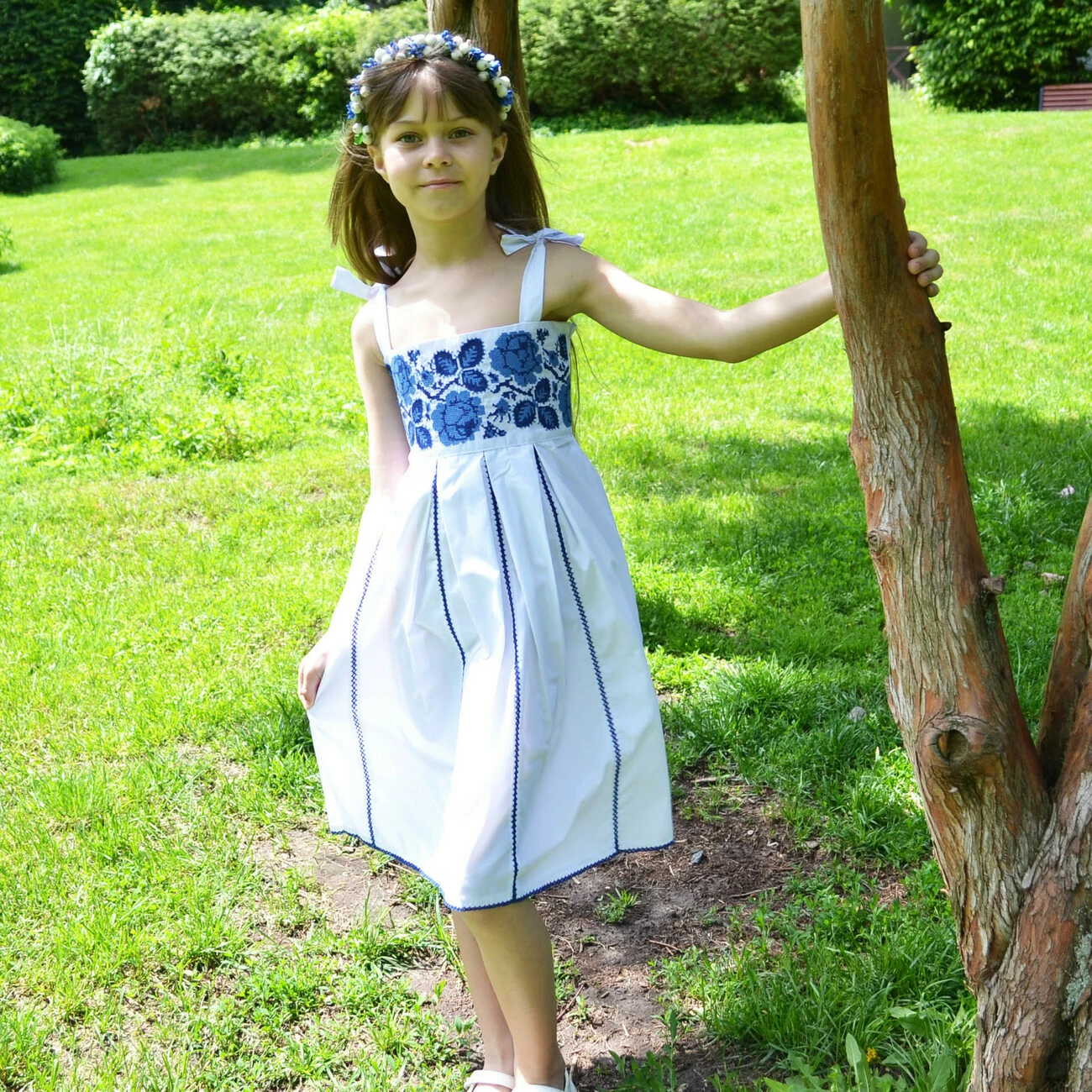 Дитячий вишитий сарафан білого кольору із зображенням квітів синіми нитками від гуртівні Leosouvenir створить неперевершений вигляд Вашої дитини.