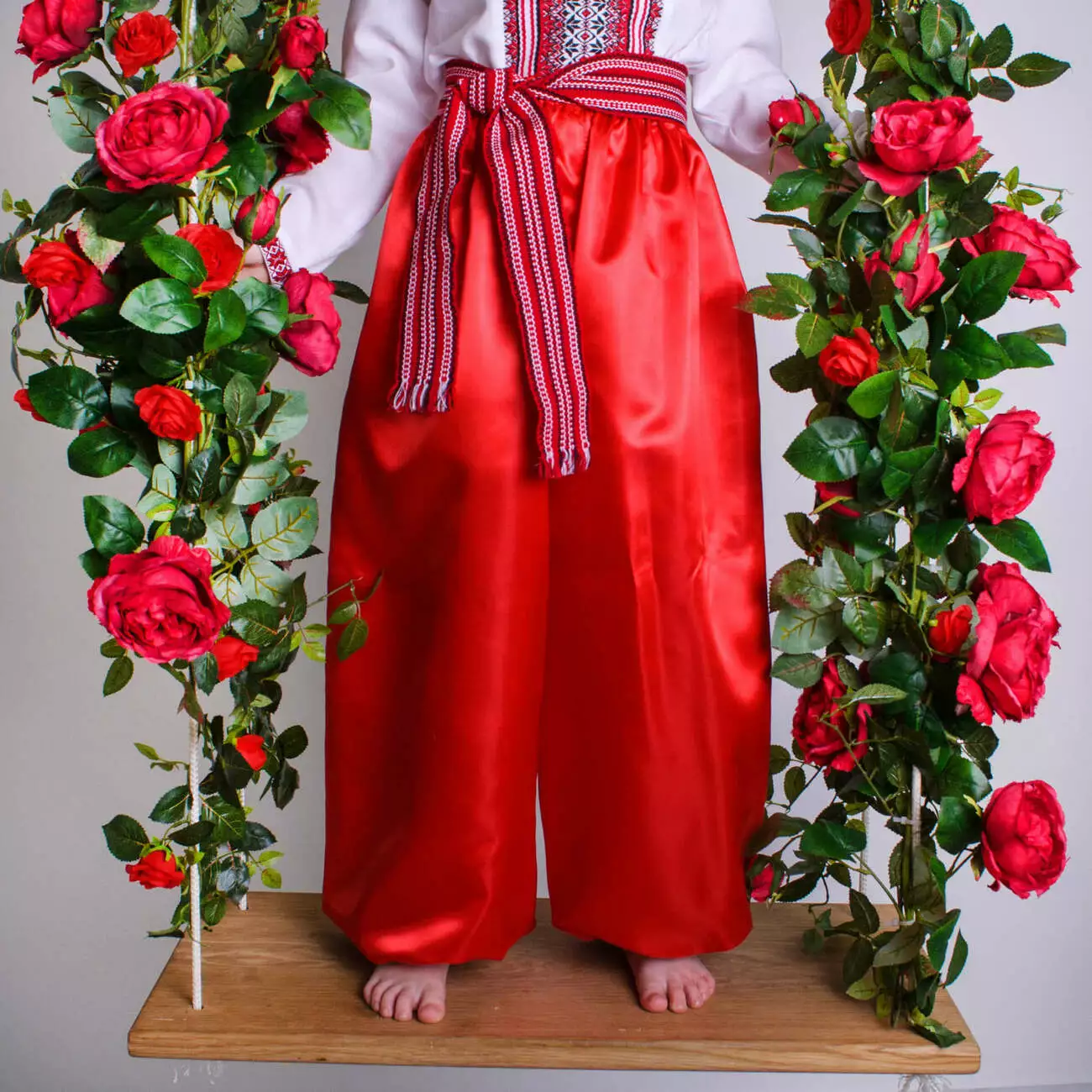 Українські штани-шаровари дитячі червоного кольору від гуртівні Leosouvenir вдало доповнять традиційний вигляд юного Українця.