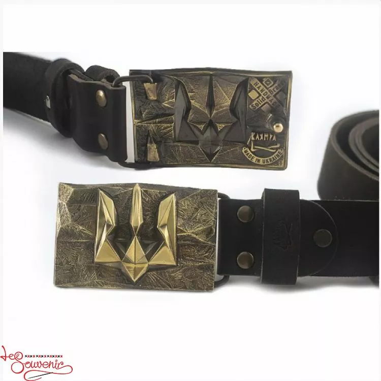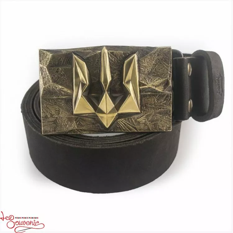 Шкіряний чорний ремінь із золотистою пряжкою із зображенням Тризуба від гуртівні Leosouvenir.