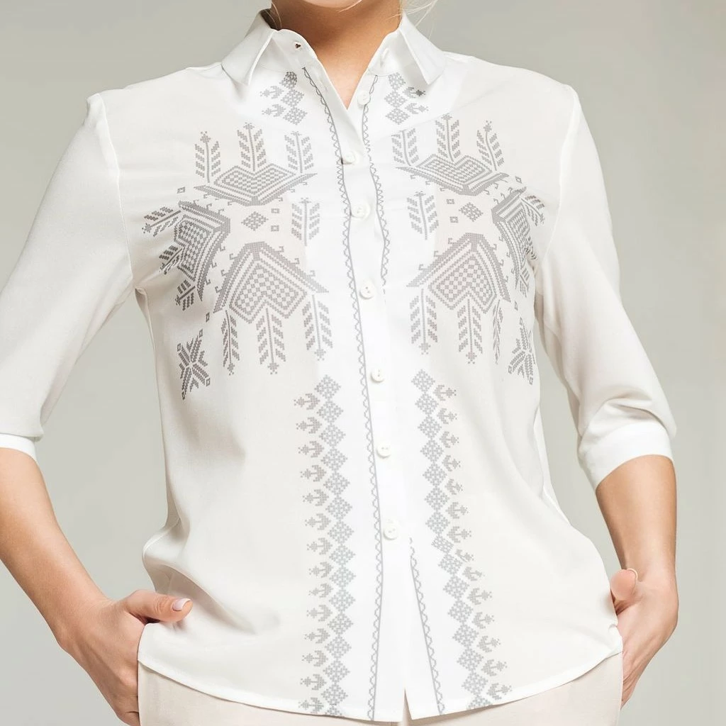Жіноча сорочка-блуза із оригінальним орнаментом сірого кольору від гуртівні Leosouvenir вдало підкреслить Ваш неперевершений смак і стиль.