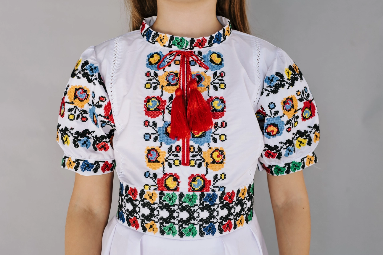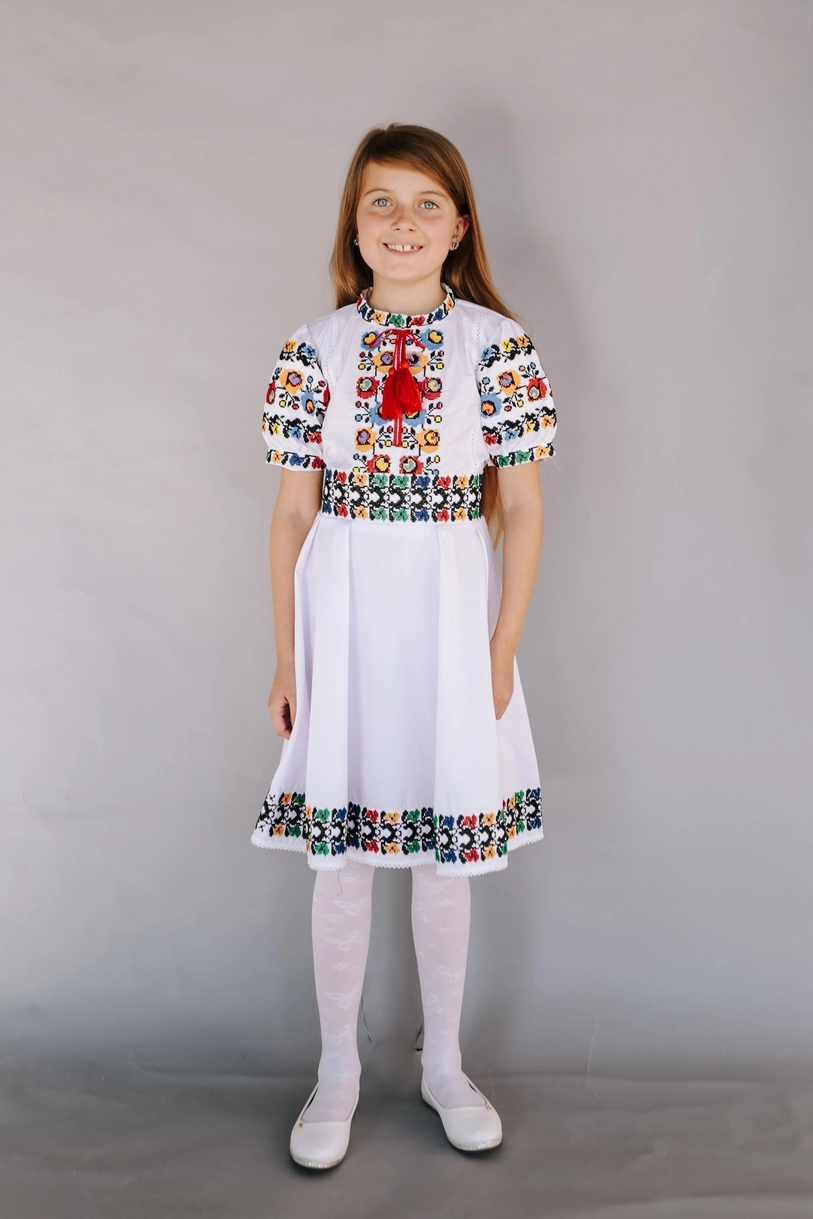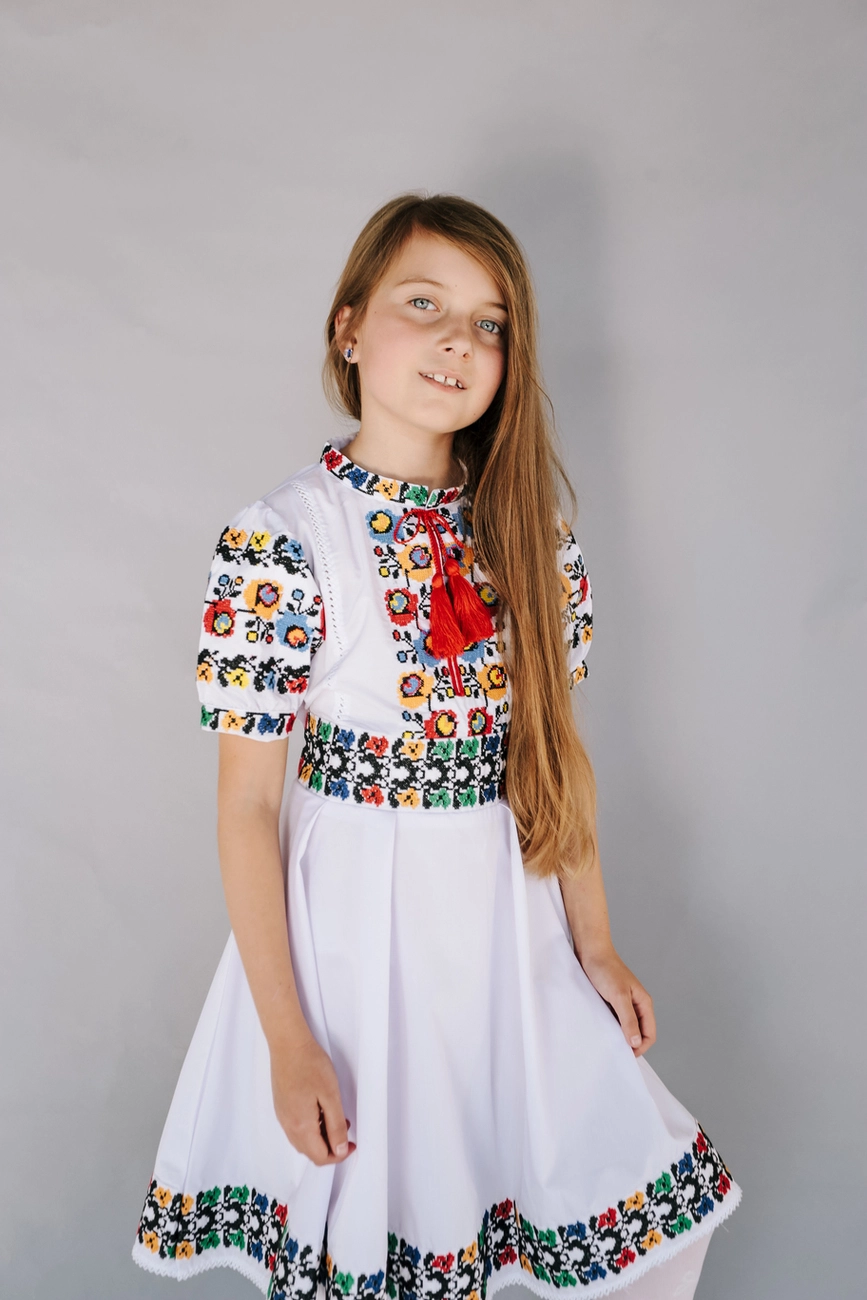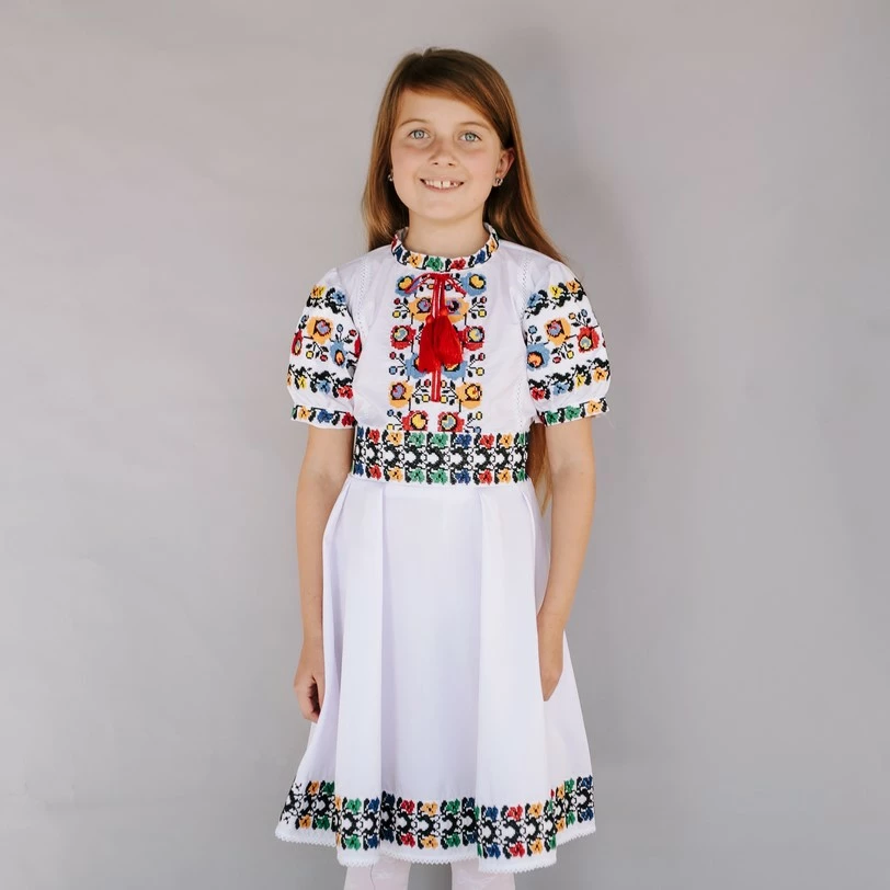 Дитяча сукня білого кольору, вишита яскраво-кольоровими нитками з коротким рукавом, від гуртівні Leosouvenir створить неперевершений вигляд Вашої дитини.