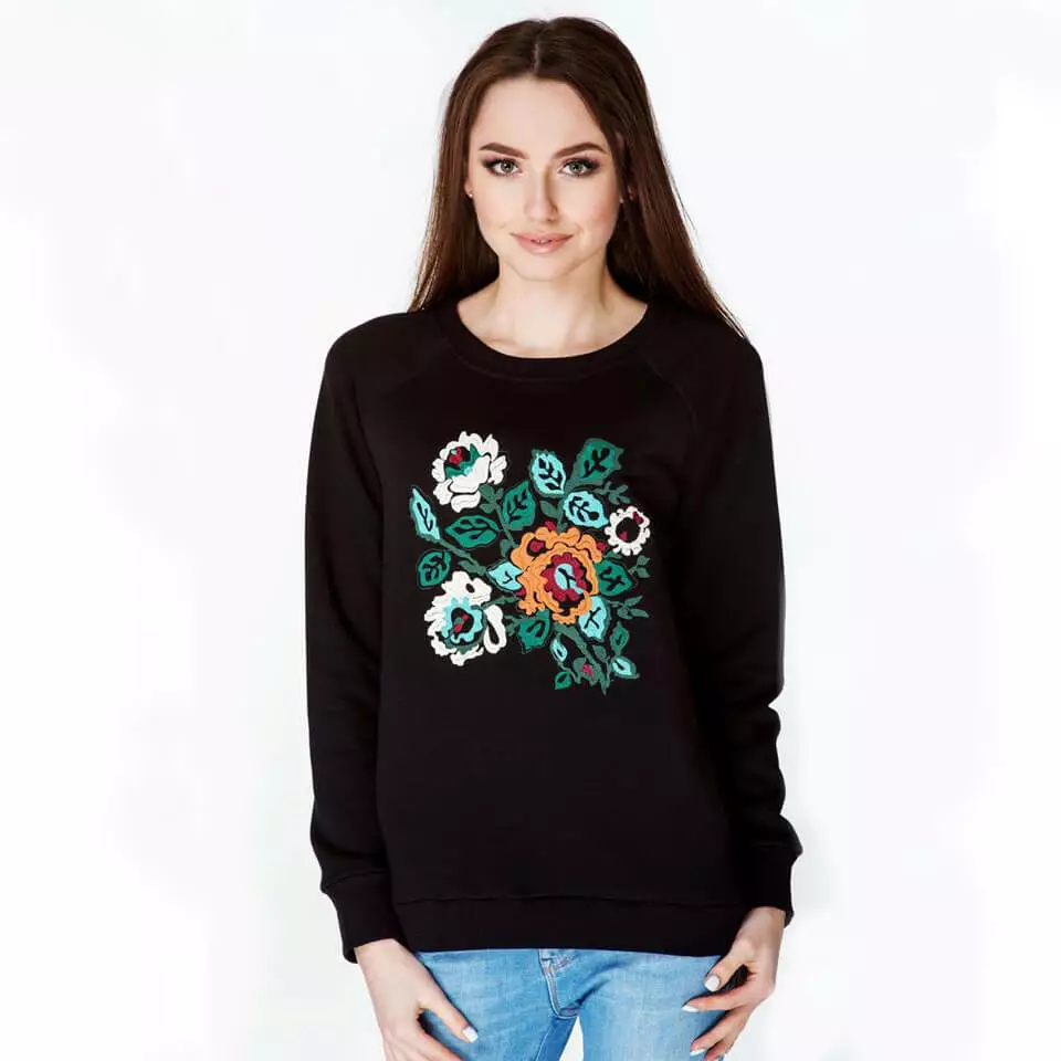 Жіночий стильний теплий світшот із яскравою квітковою вишивкою на чорному тлі від гуртівні Leosouvenir чудово зігріє Вас у холодну погоду.