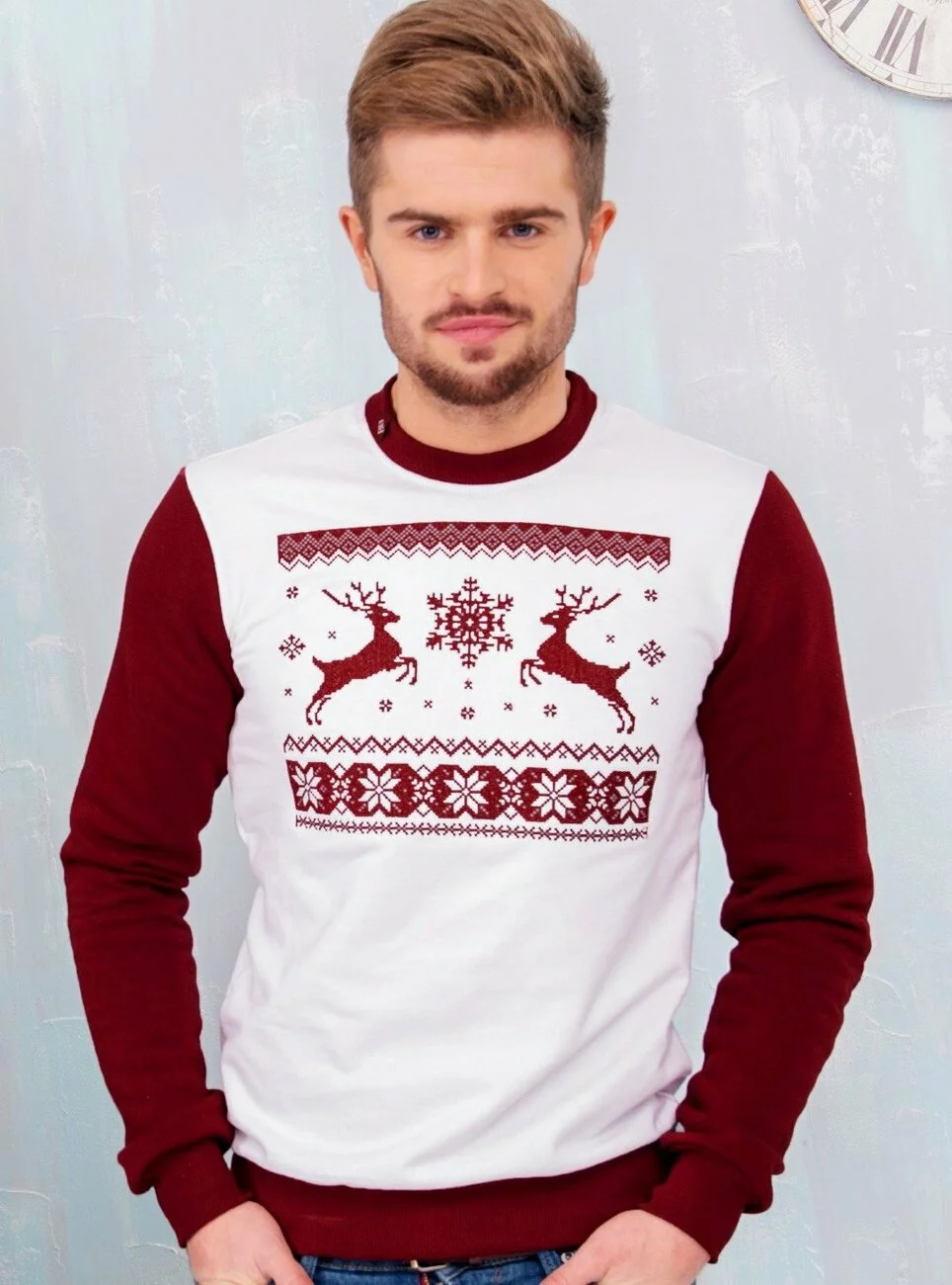 Чоловічий стильний теплий світшот із святковим зображенням на білому тлі з бордовими рукавами від гуртівні Leosouvenir чудово зігріє Вас у холодну погоду.