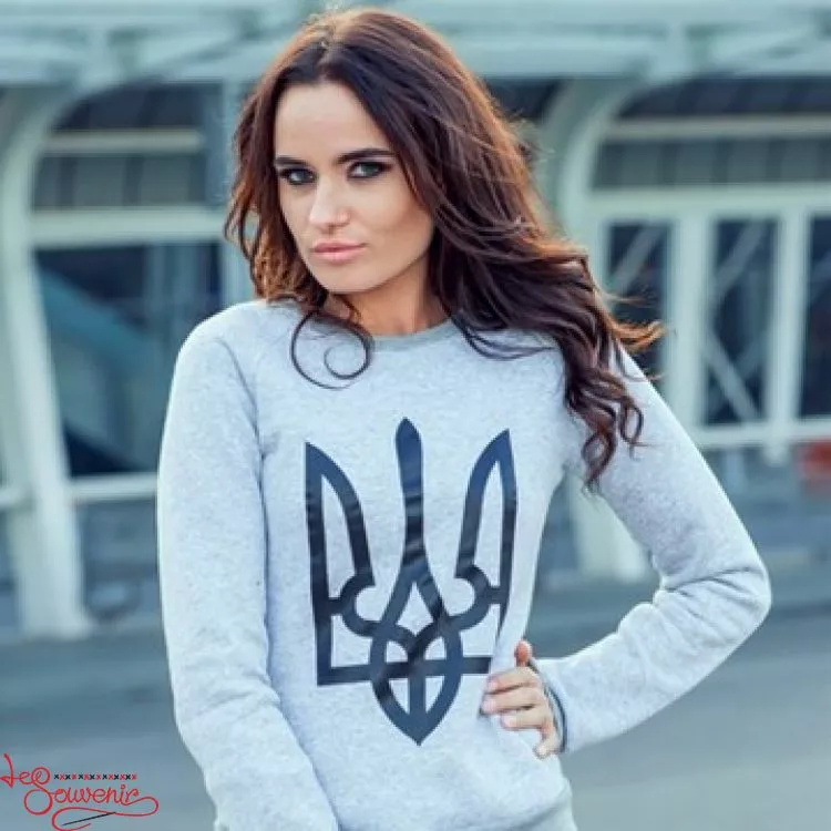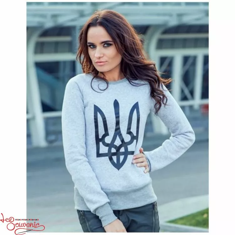 Жіночий стильний теплий світшот із яскравим принтованим зображенням тризуба на сірому тлі від гуртівні Leosouvenir чудово зігріє Вас у холодну погоду.