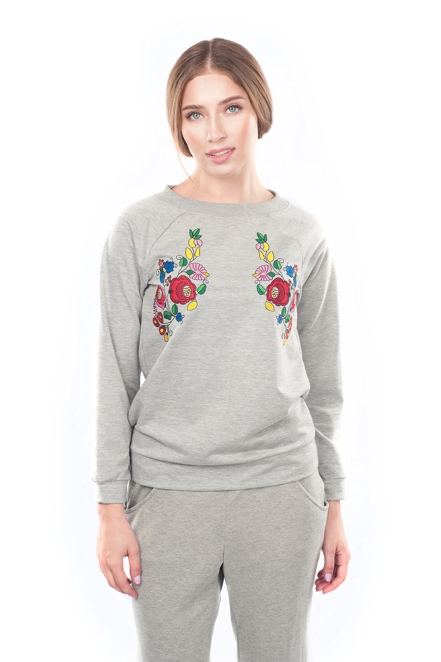 Жіночий стильний теплий світшот із яскравою вишивкою на сірому тлі від гуртівні Leosouvenir чудово зігріє Вас у холодну погоду.