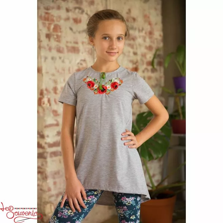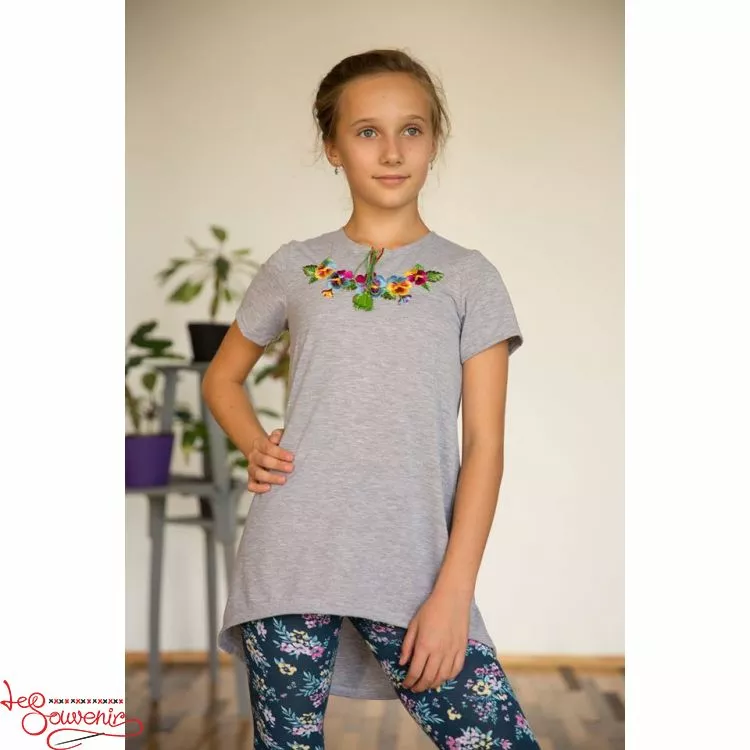 Вишита туніка із яскравою вишивкою гладдю на сірому тлі від гуртівні Leosouvenir чудово пасуватие Вашій юній Україночці.