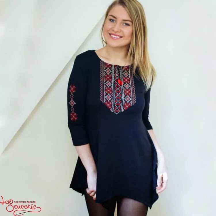 Жіноча туніка із зображенням вишитого червоного орнаменту на чорному тлі від гуртівні Leosouvenir чудово підкреслить Ваш неперевершений смак і стиль.