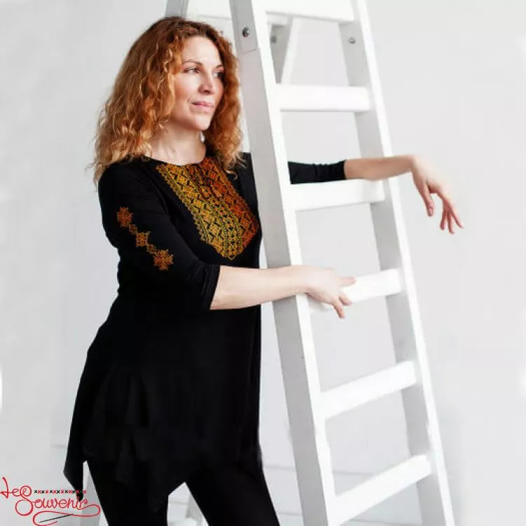 Жіноча туніка із зображенням вишитого оранжевого орнаменту на чорному тлі від гуртівні Leosouvenir чудово підкреслить Ваш неперевершений смак і стиль.