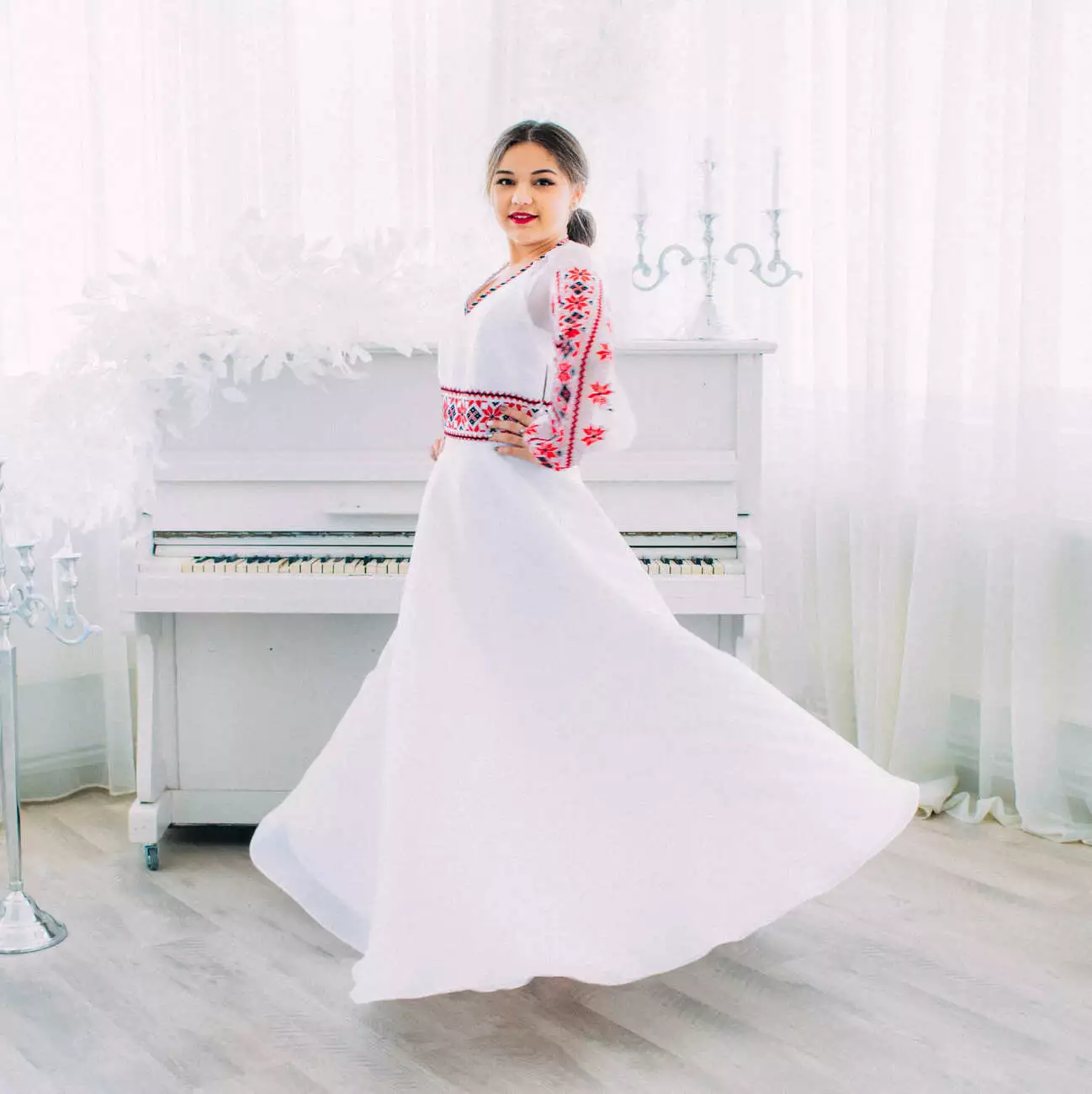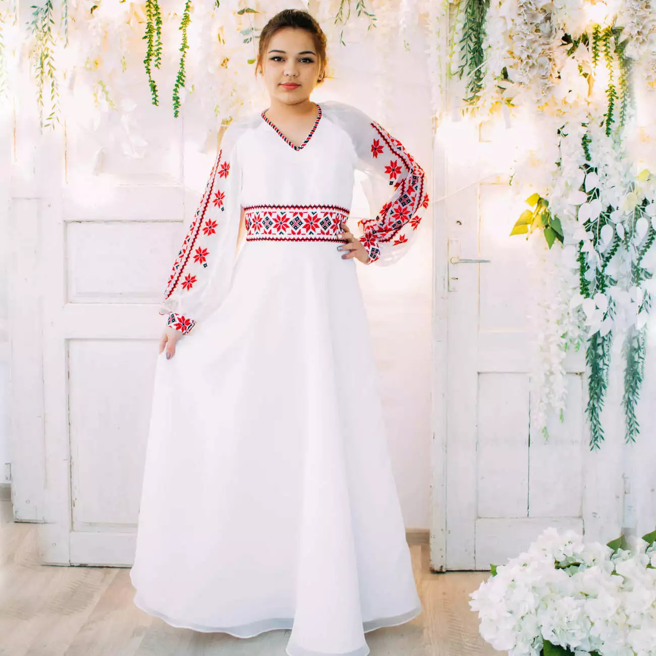 Модель: Весільна сукня з червоною вишивкою.