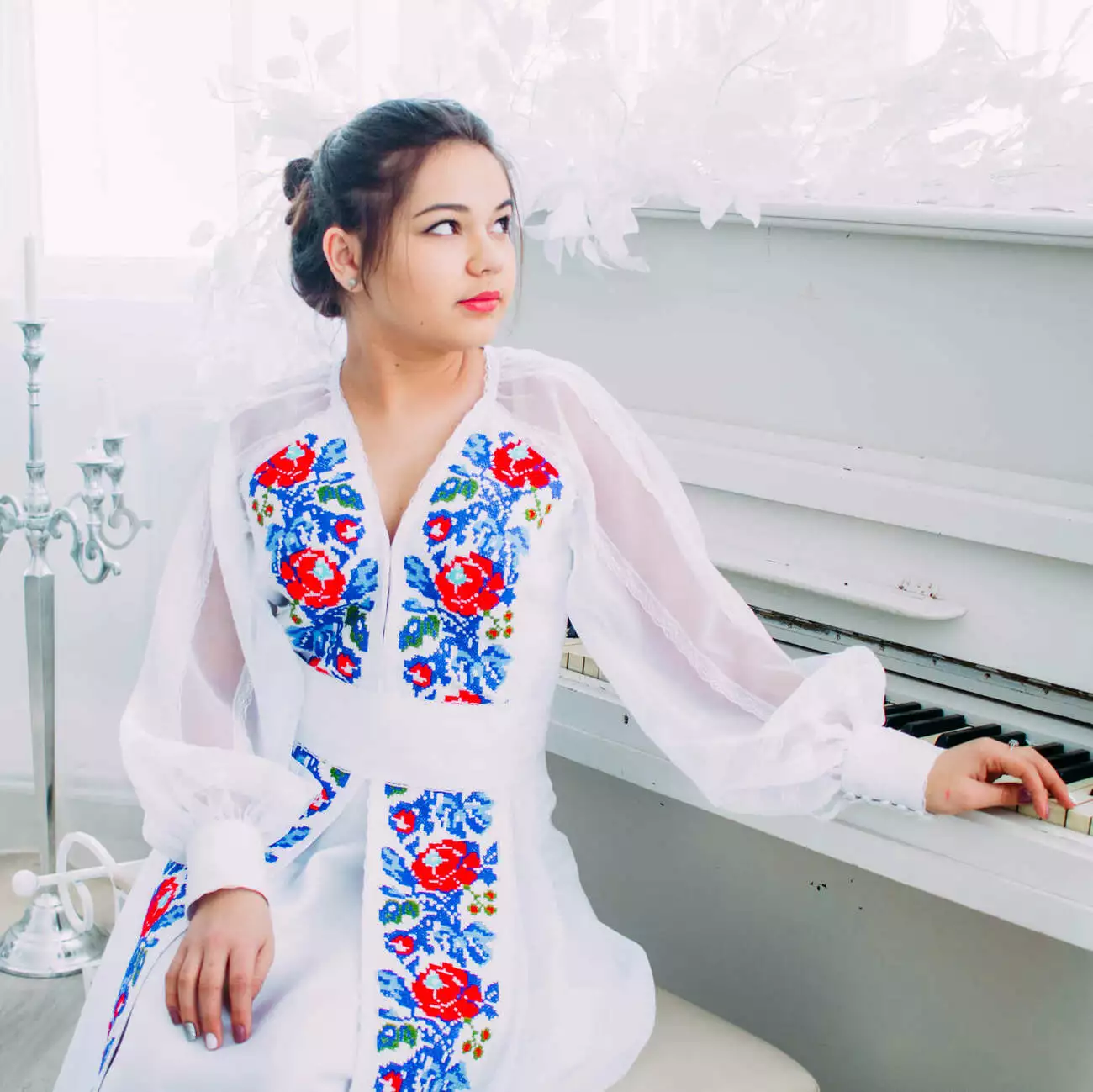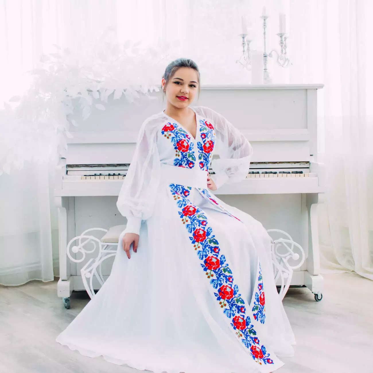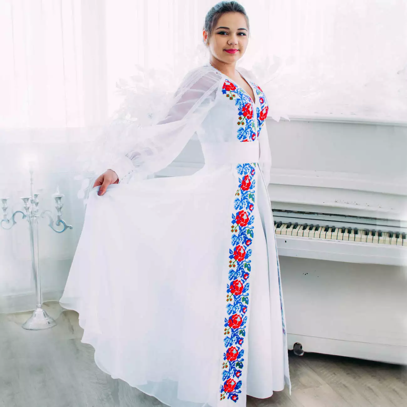 Весільна сукня, чудово виконана на делікатній тканині із оригінальним вишитим яскравим візерунком вздовж всього плаття з пояском, від гуртівні Leosouvenir зробить Вас неймовірною нареченою в особливий день.