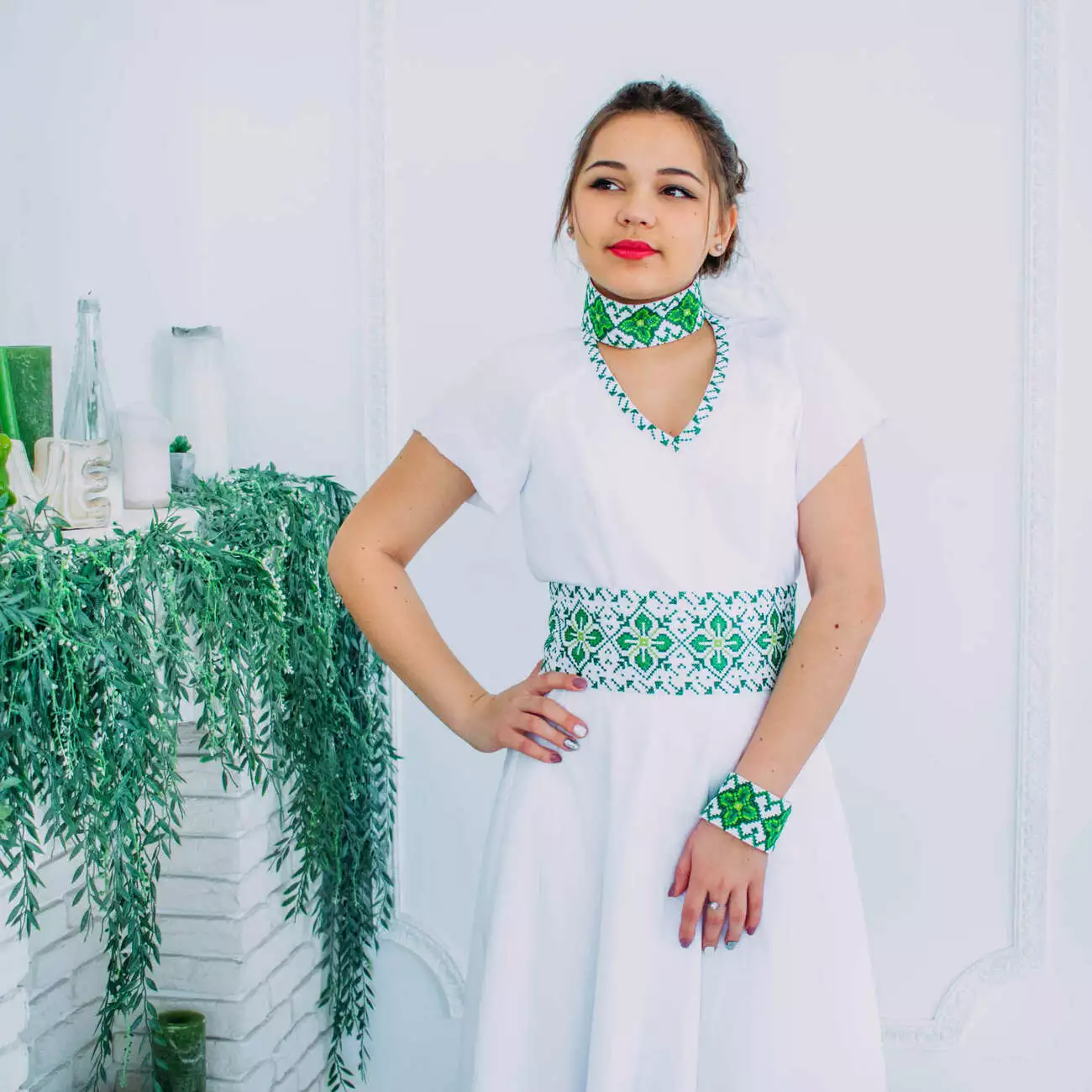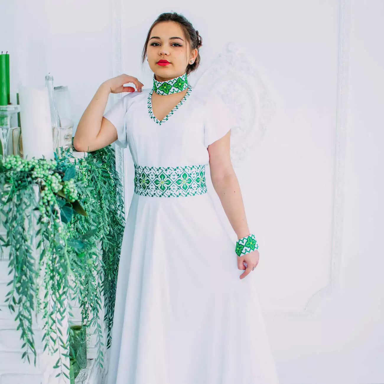 Весільна сукня, чудово виконана на делікатній тканині із оригінальним вишитим зеленим візерунком з пов'язками на шию та руку, від гуртівні Leosouvenir зробить Вас неймовірною нареченою в особливий день.