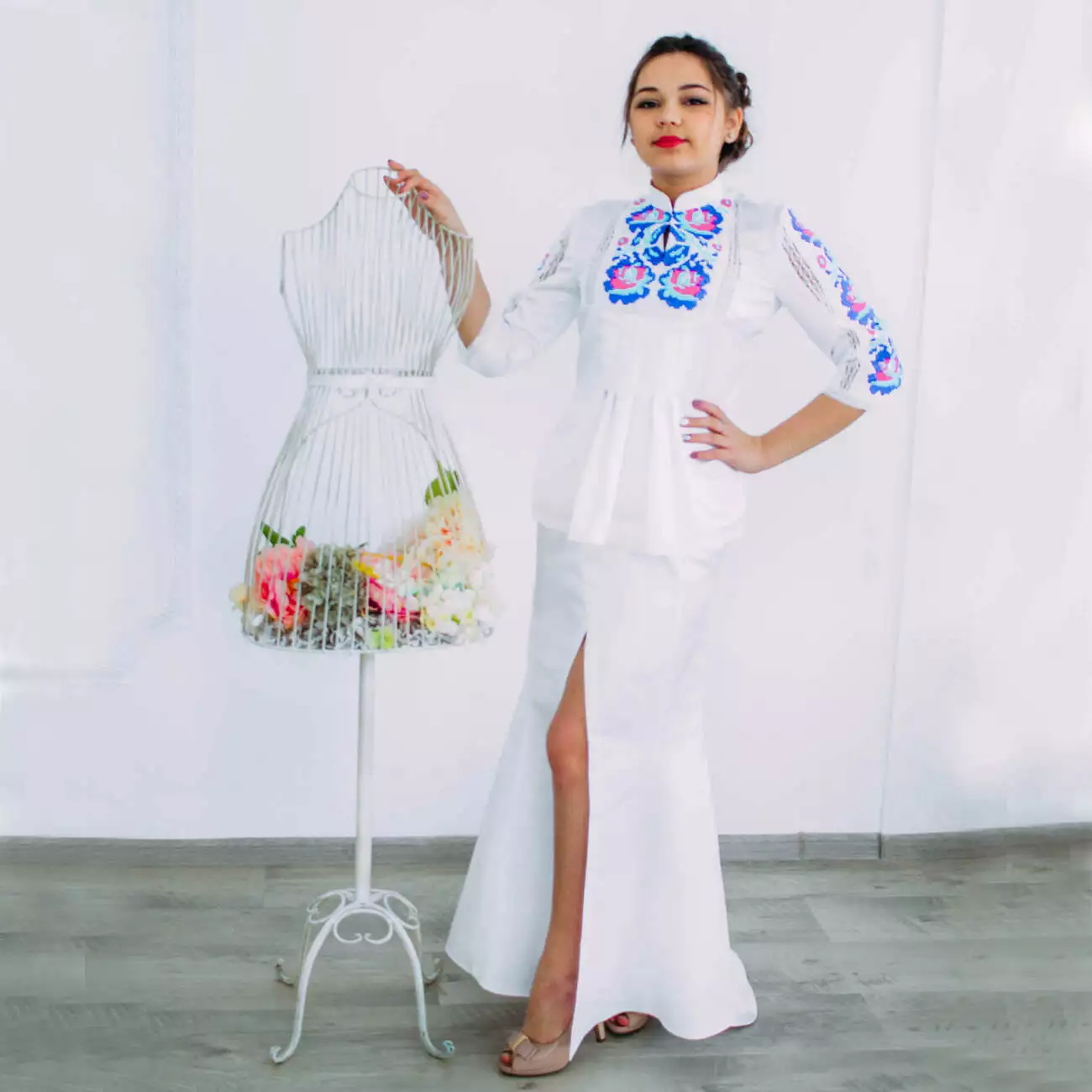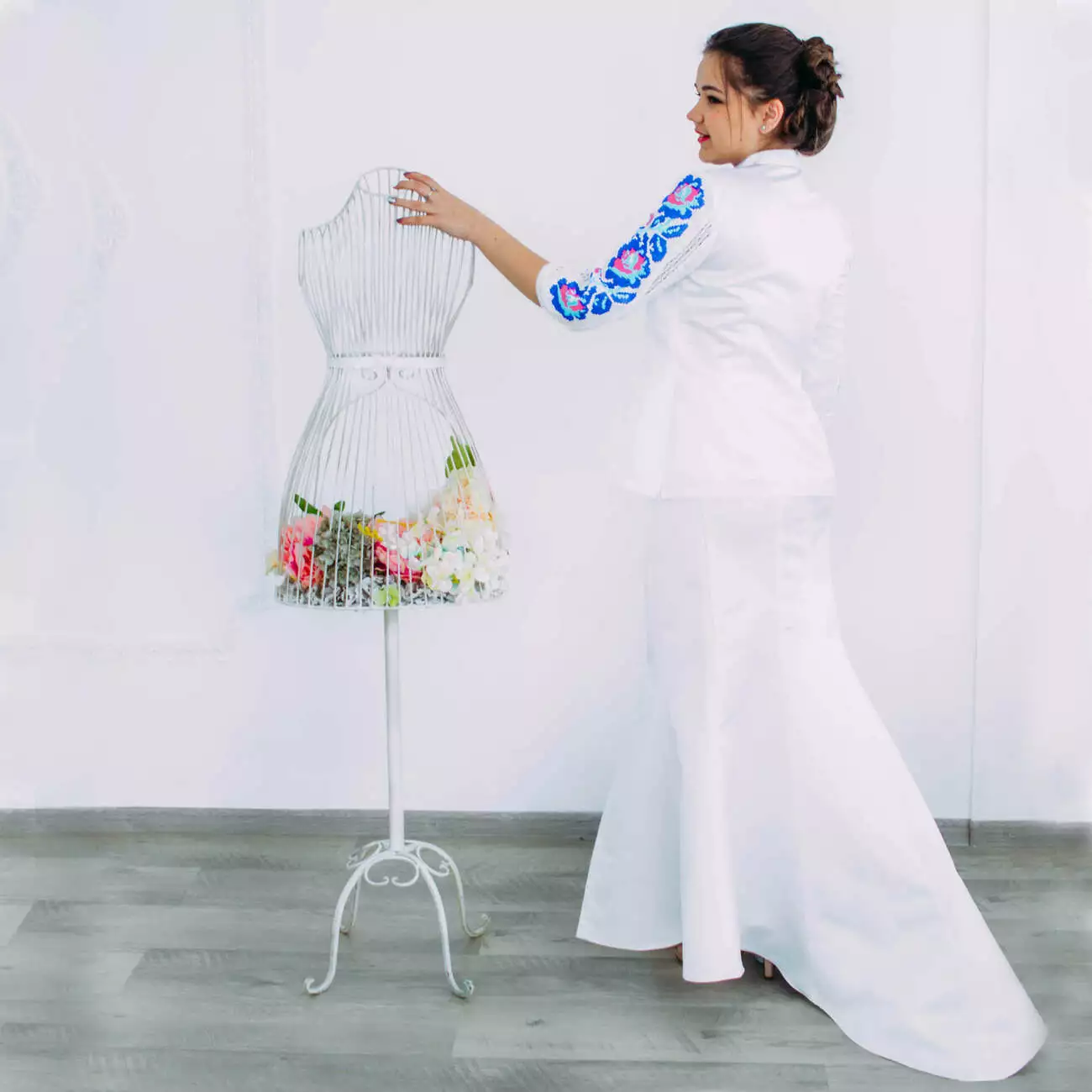Модель: Весільний костюм з квітковою вишивкою.