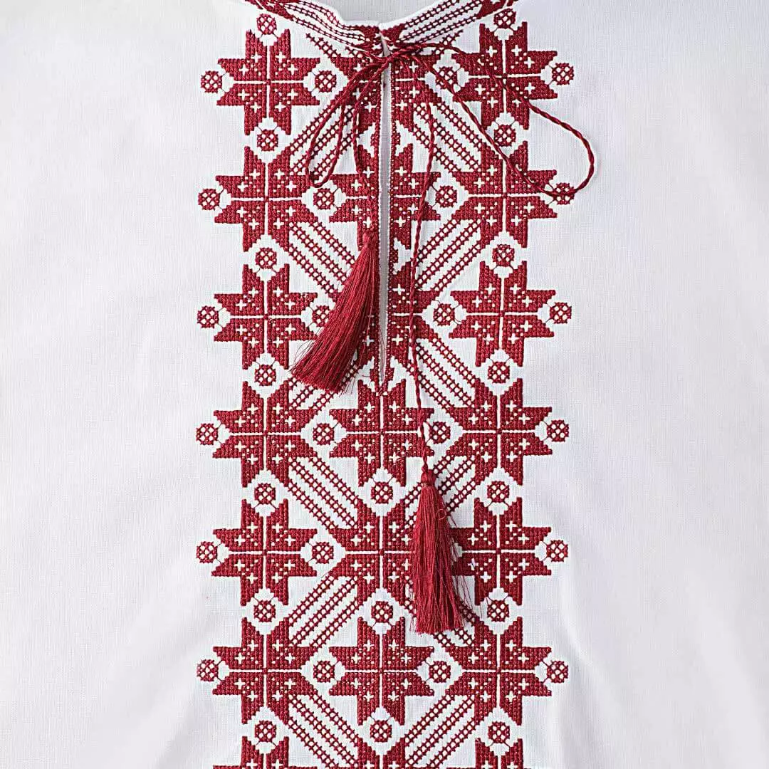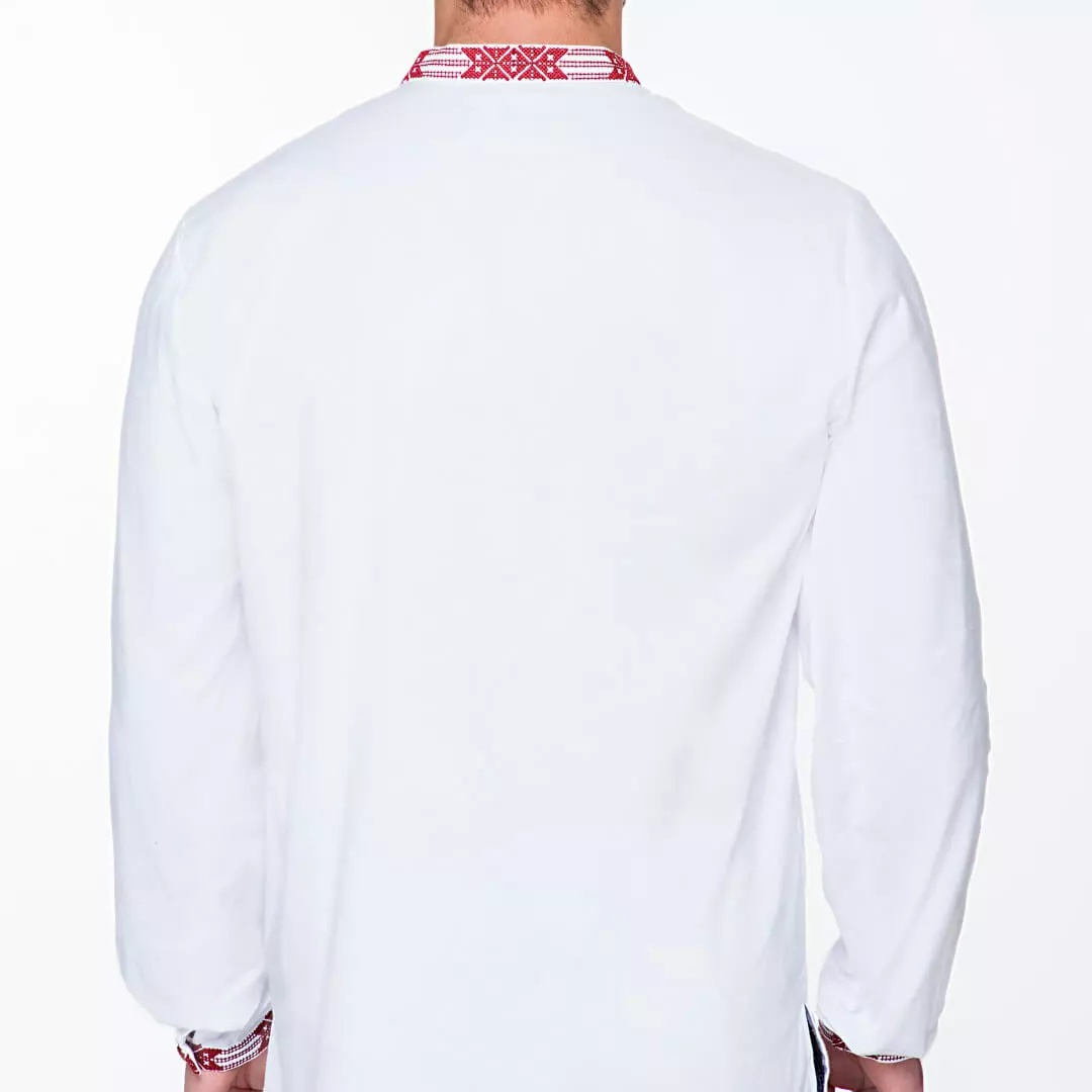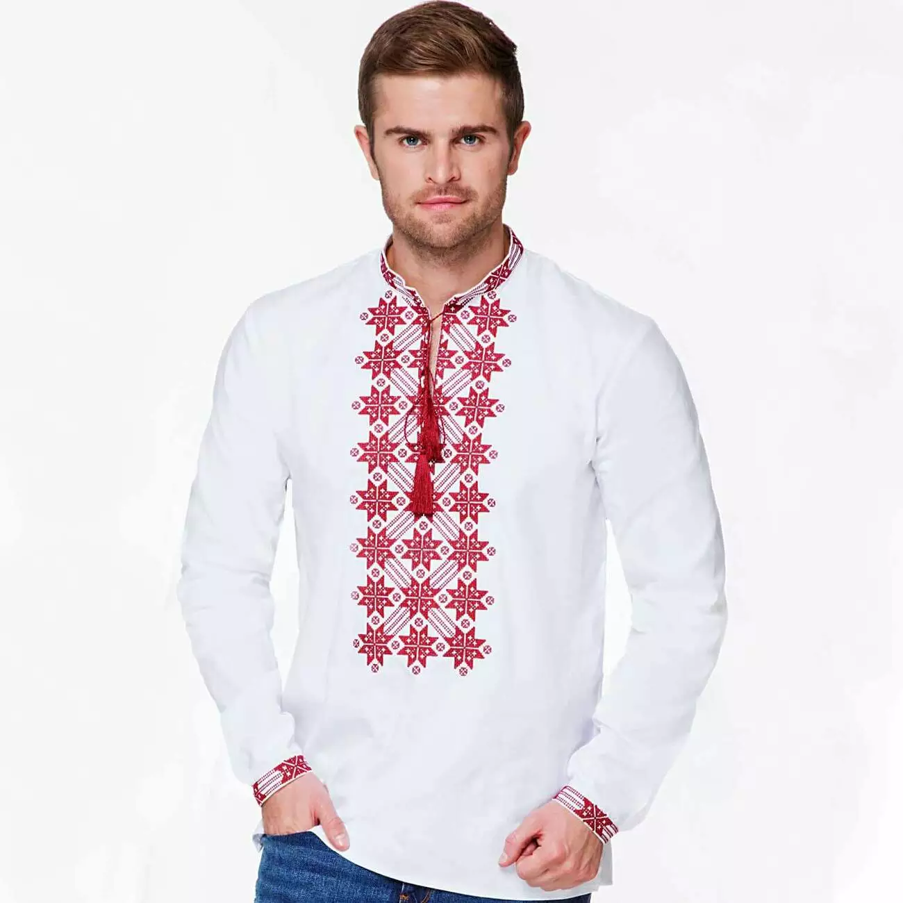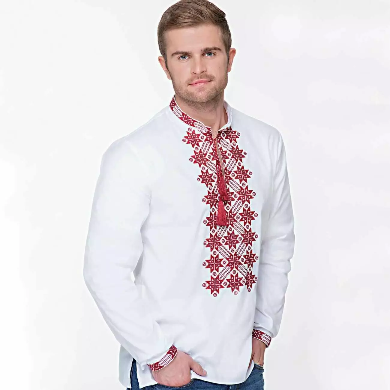 Чоловіча вишиванка виконана червоними нитками, які чудово контрастують із натуральною тканиною від гуртівні Leosouvenir має багатий та святковий вигляд.