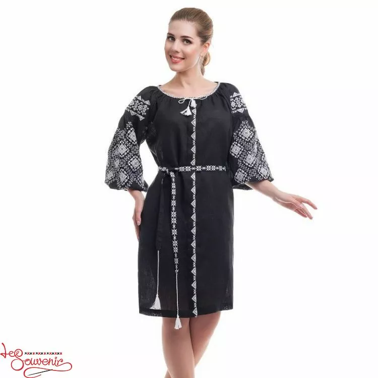 Жіноча сукня з пояском, чудово виконана на делікатній тканині із оригінальним орнаментом на рукавах, від гуртівні Leosouvenir чудово підкреслить Ваш неперевершений смак і стиль.