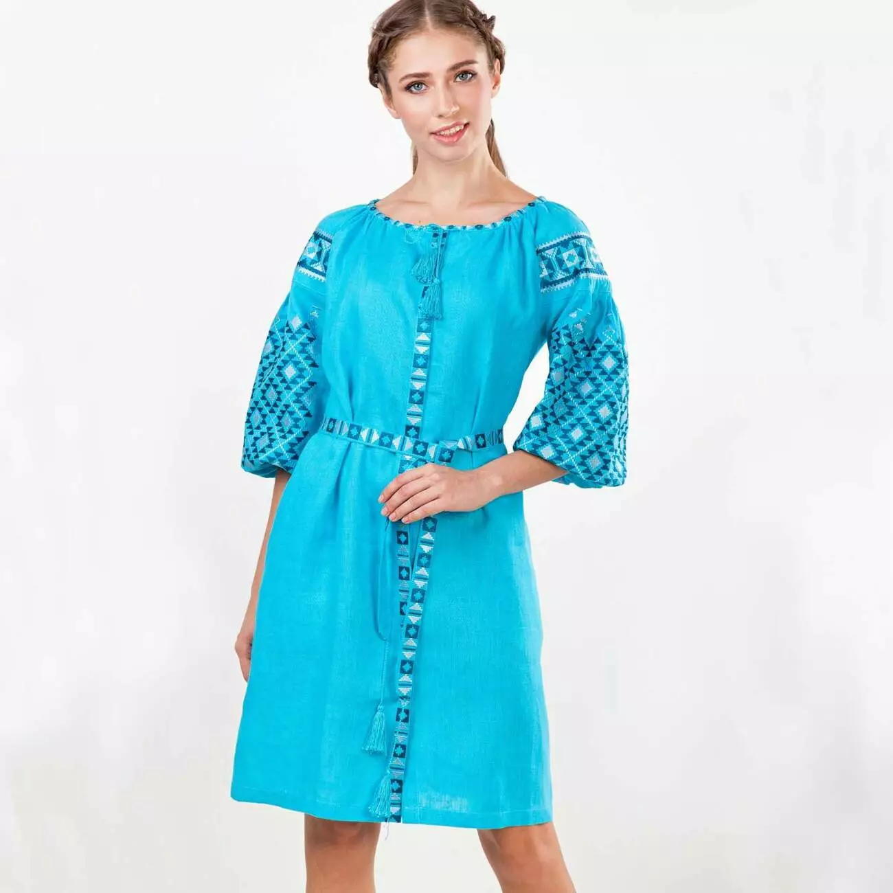 Жіноча сукня з пояском, чудово виконана на делікатній тканині кольору бірюзи із оригінальним орнаментом на рукавах, від гуртівні Leosouvenir чудово підкреслить Ваш неперевершений смак і стиль.
