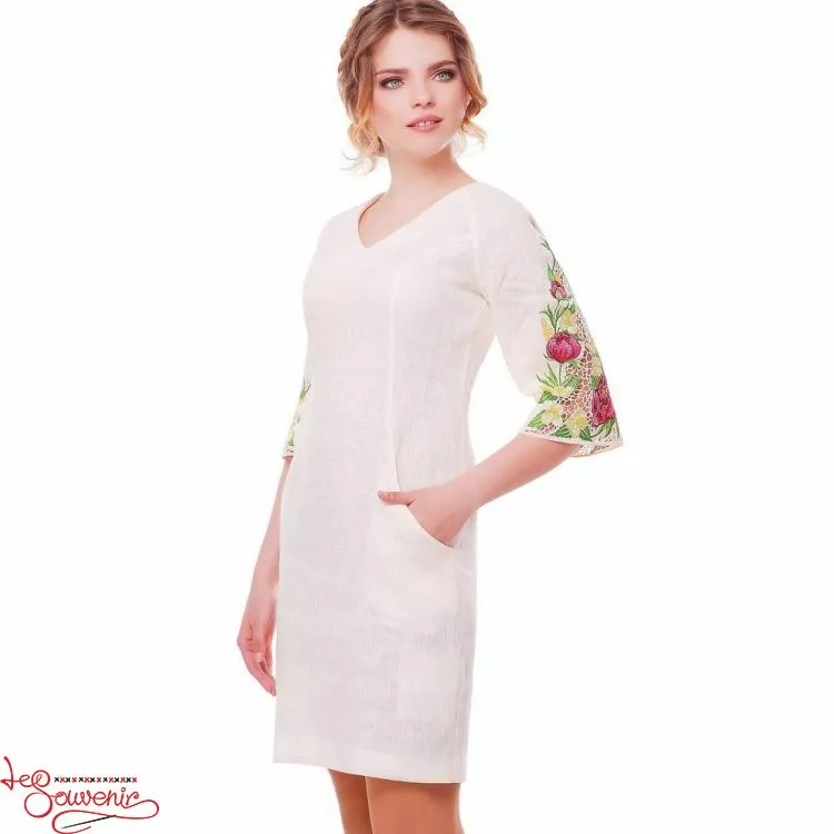Жіноча сукня з мереживом, чудово виконана на делікатній тканині із оригінальним орнаментом на рукавах, від гуртівні Leosouvenir чудово підкреслить Ваш неперевершений смак і стиль.