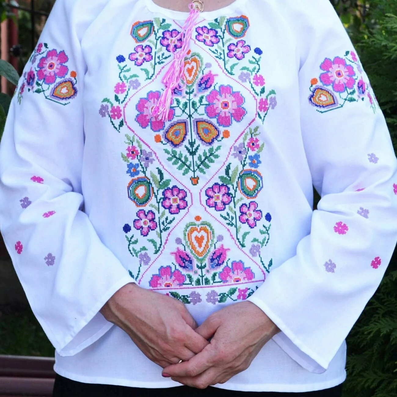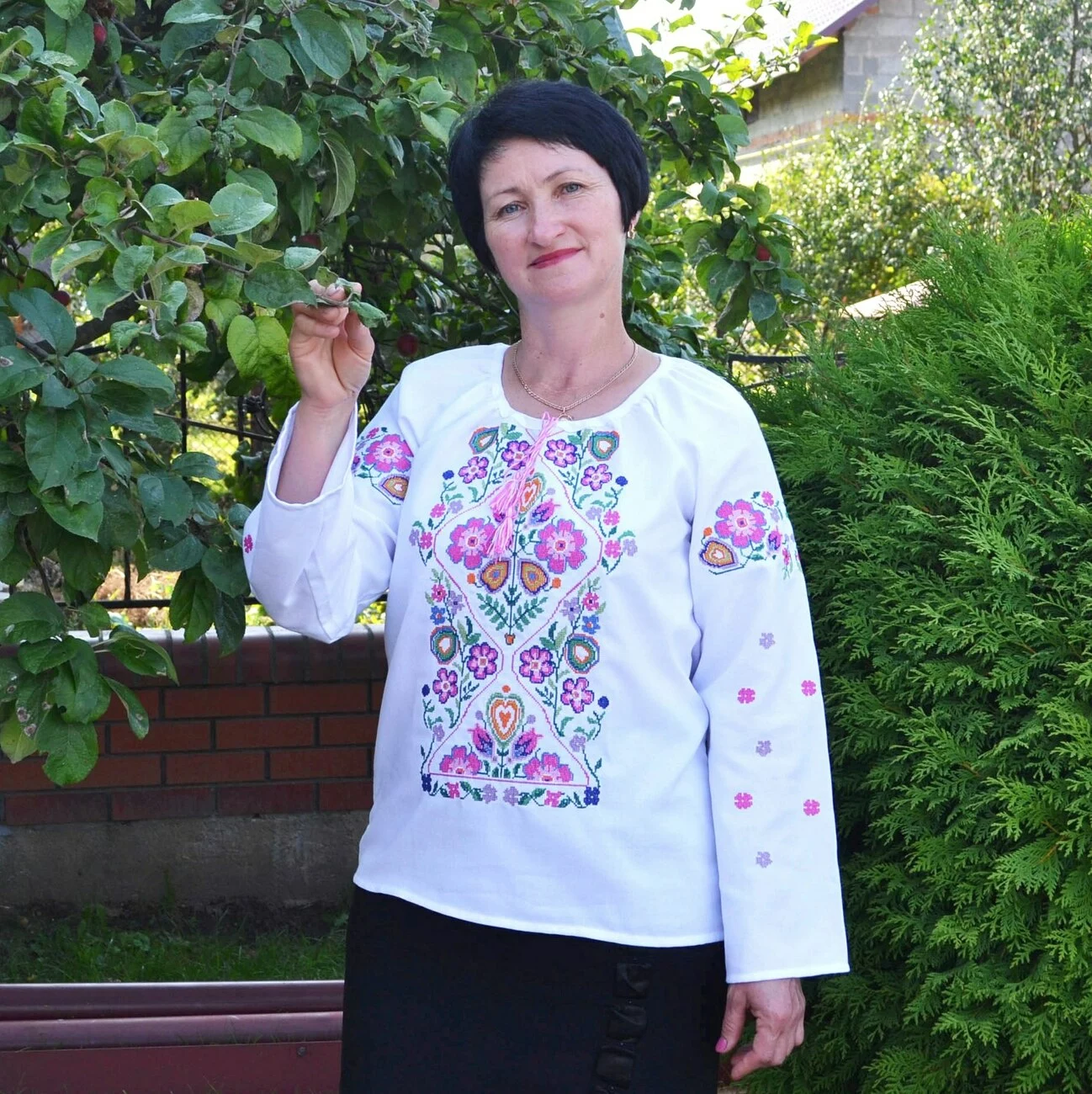 Жіноча вишиванка, вишита нитками яскравих кольорів на делікатній тканині, від гуртівні Leosouvenir має багатий та святковий вигляд.