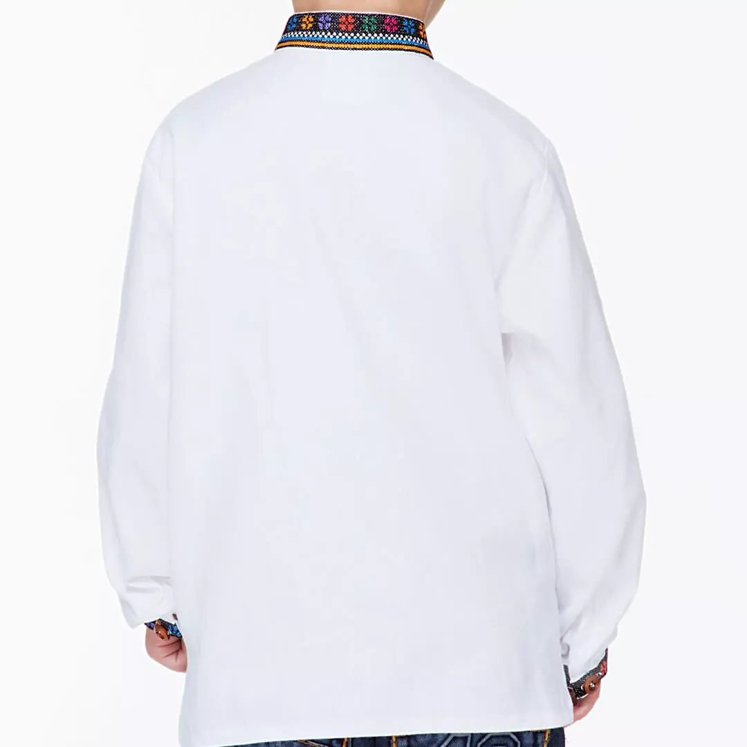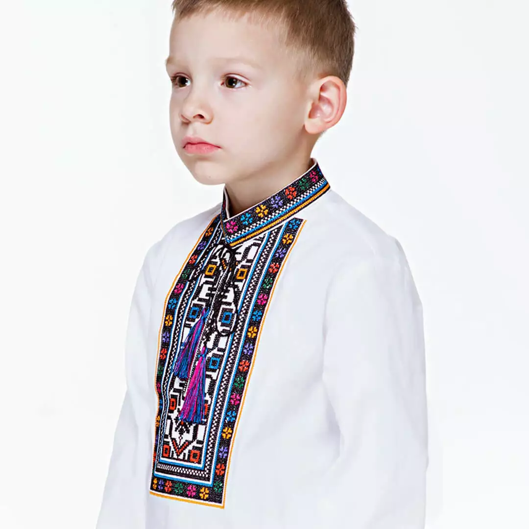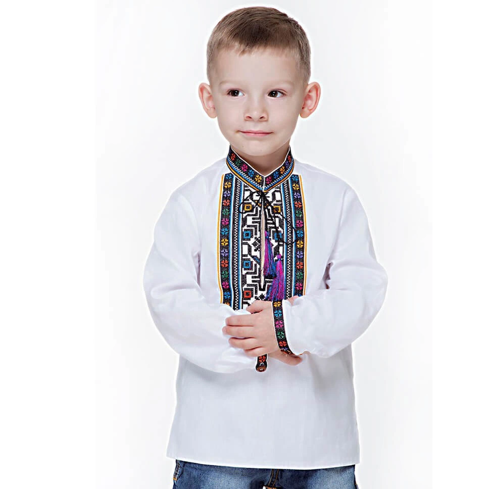 Дитяча вишиванка виконана кольоровими нитками, які чудово контрастують із білою тканиною від гуртівні Leosouvenir має багатий та святковий вигляд.