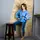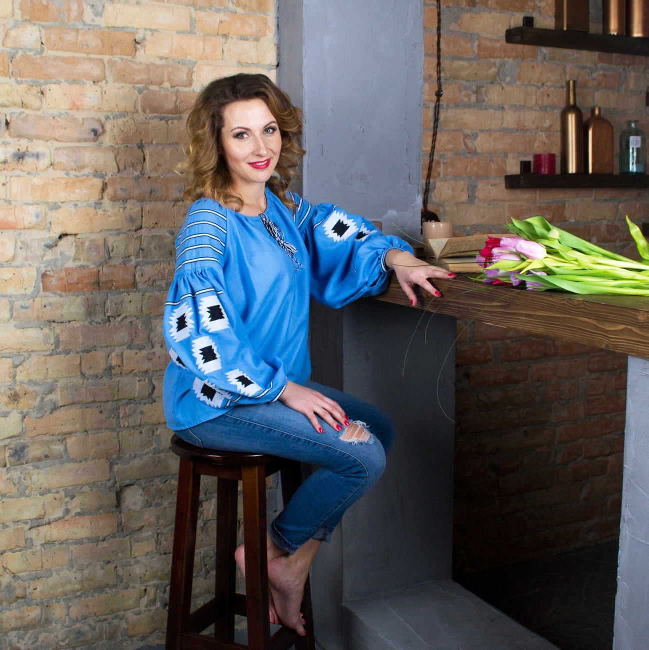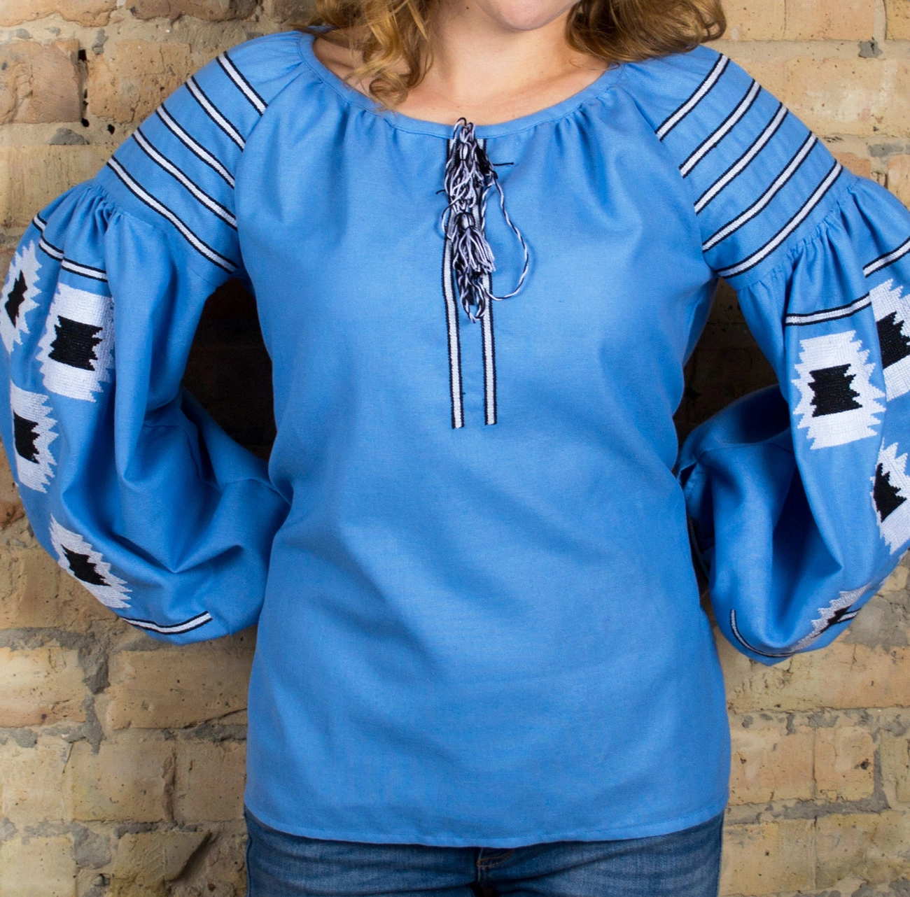Жіноча стильна вишиванка виконана біло-чорними нитками, які чудово контрастують із делікатною блакитною тканиною, від гуртівні Leosouvenir має багатий та святковий вигляд.