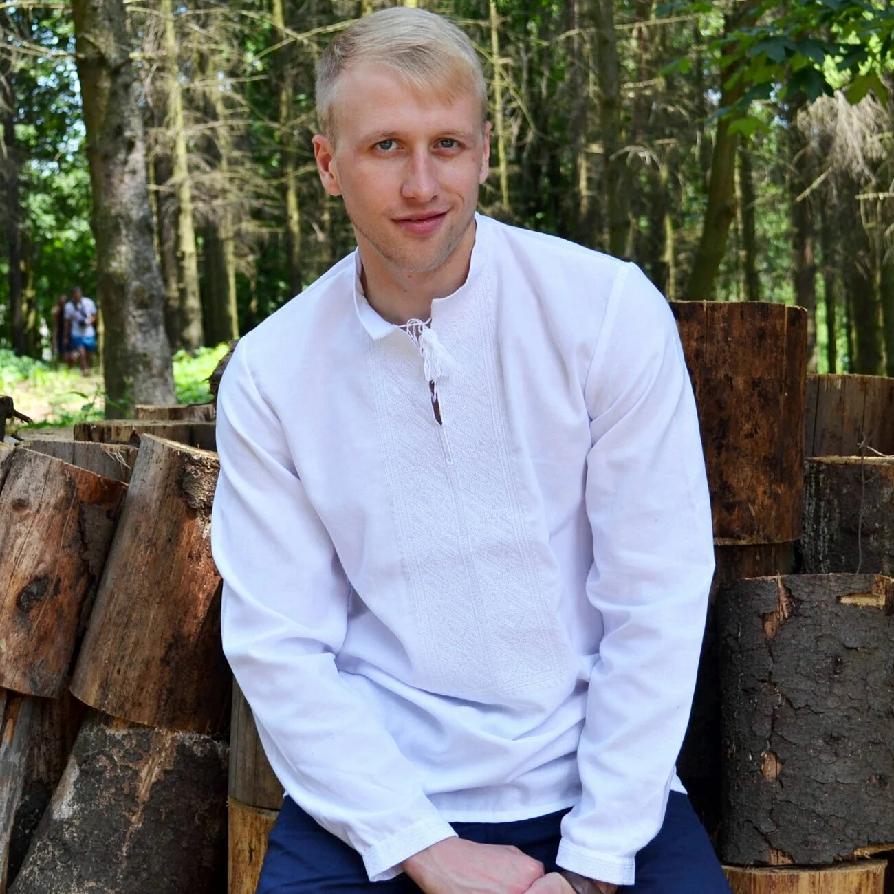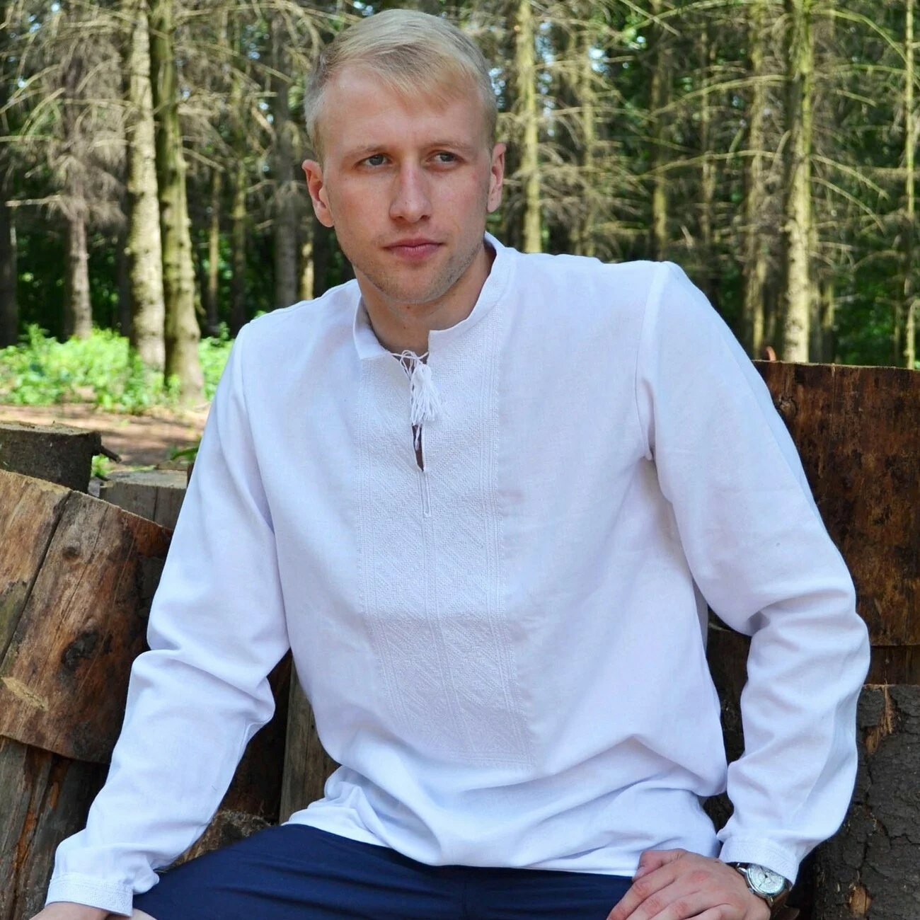 Чоловіча вишиванка, виконана ниткою білого кольору, яка чудово контрастує із натуральною тканиною, від гуртівні Leosouvenir має багатий та святковий вигляд.