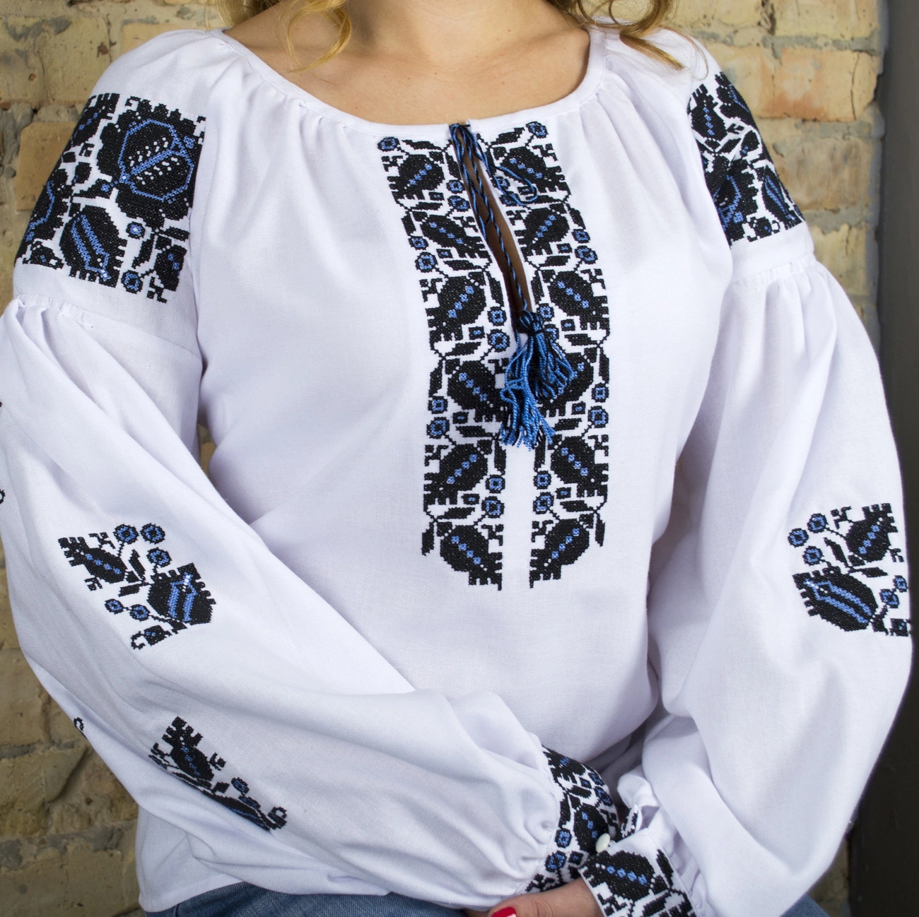 Жіноча стильна вишиванка виконана синьо-чорними нитками, які чудово контрастують із делікатною білою тканиною, від гуртівні Leosouvenir має багатий та святковий вигляд.
