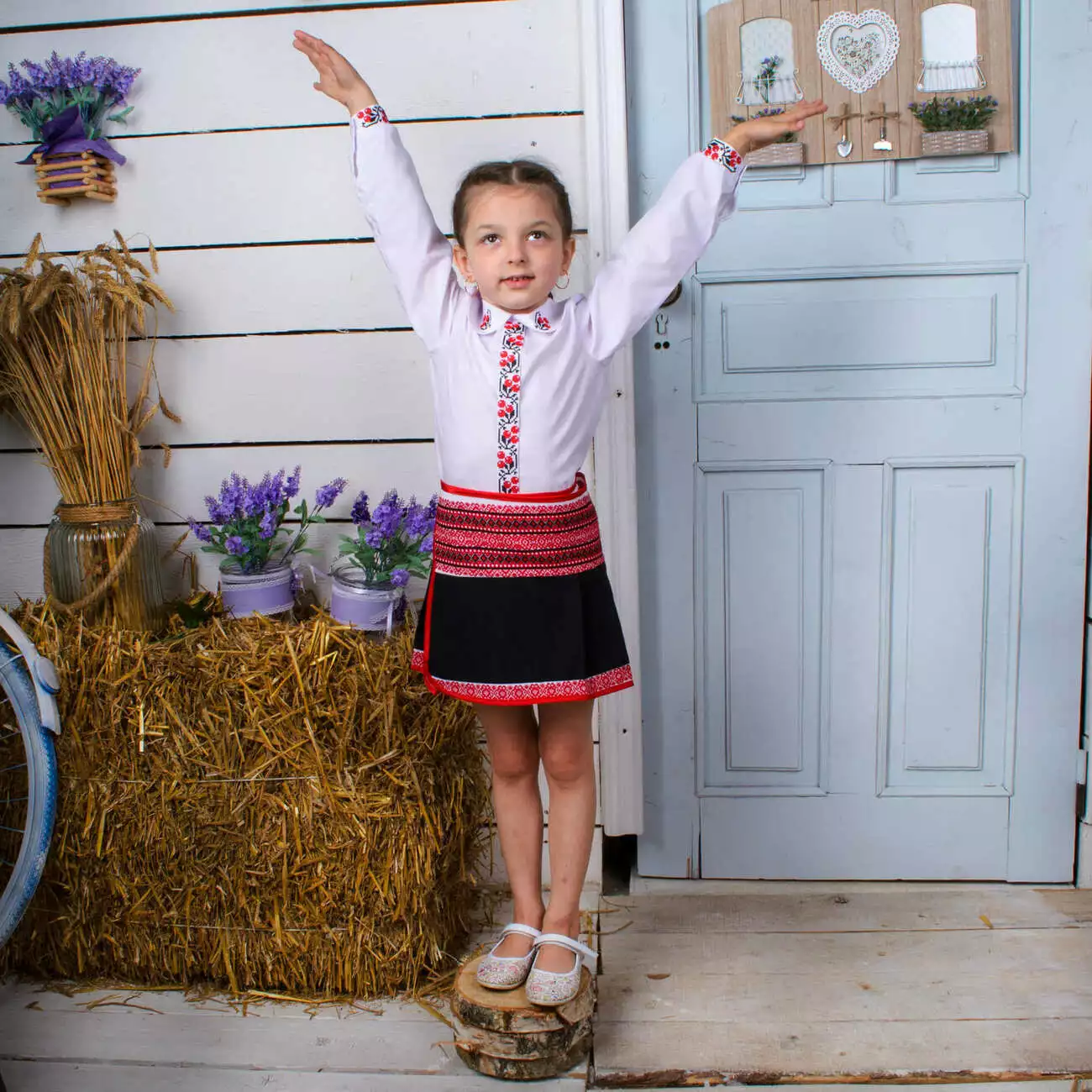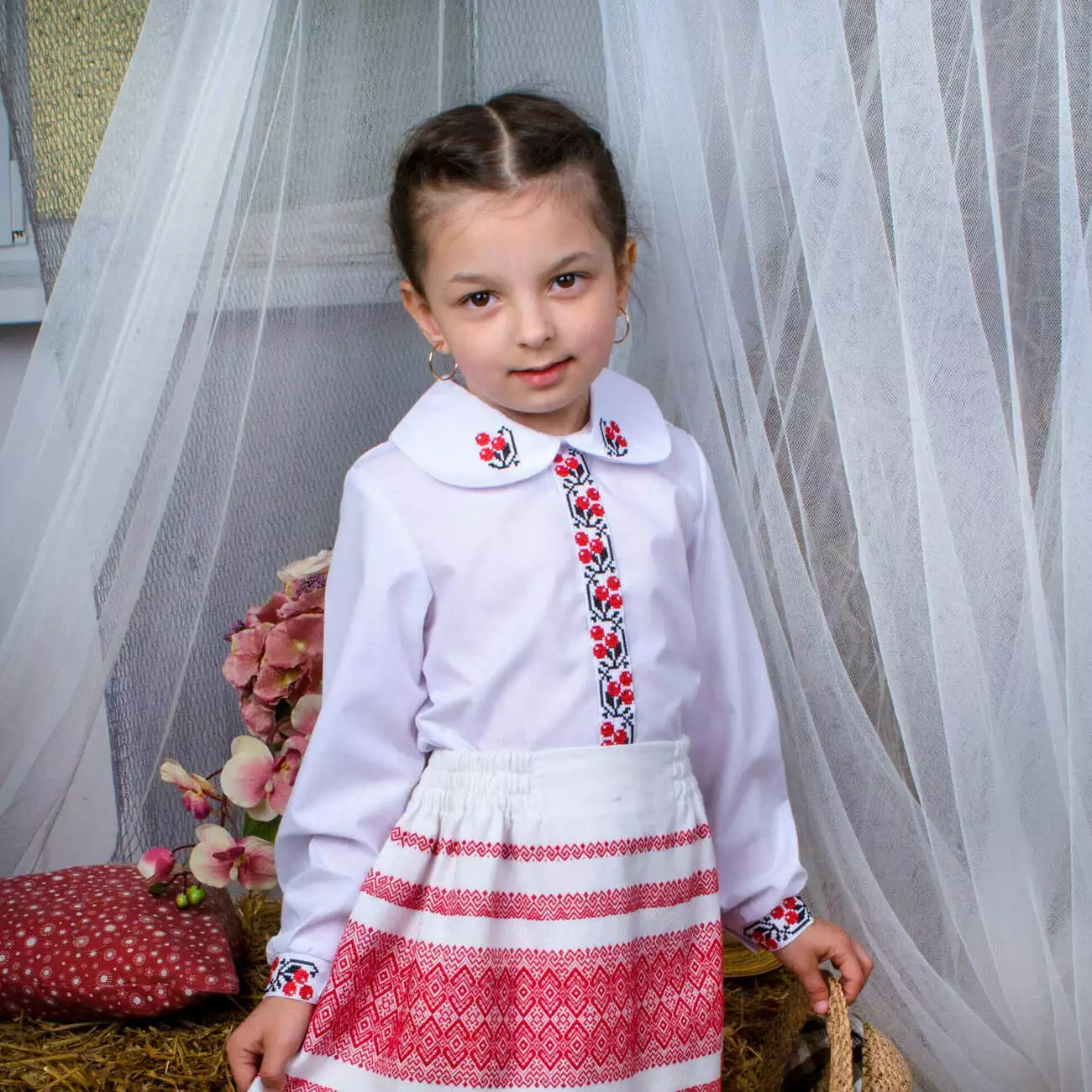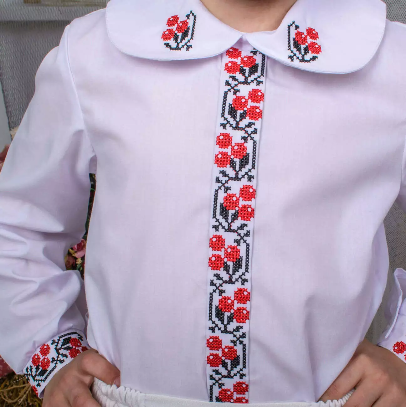 Дитяча вишиванка виконана кольоровими нитками, які чудово контрастують із білою тканиною від гуртівні Leosouvenir має багатий та святковий вигляд.