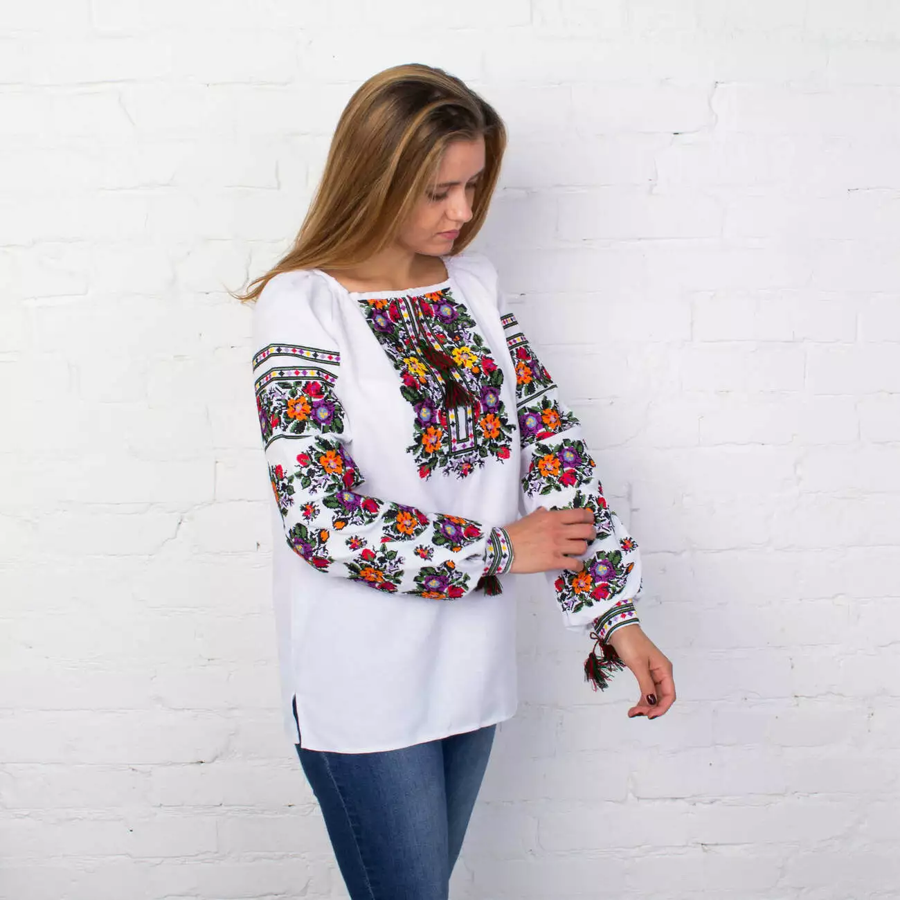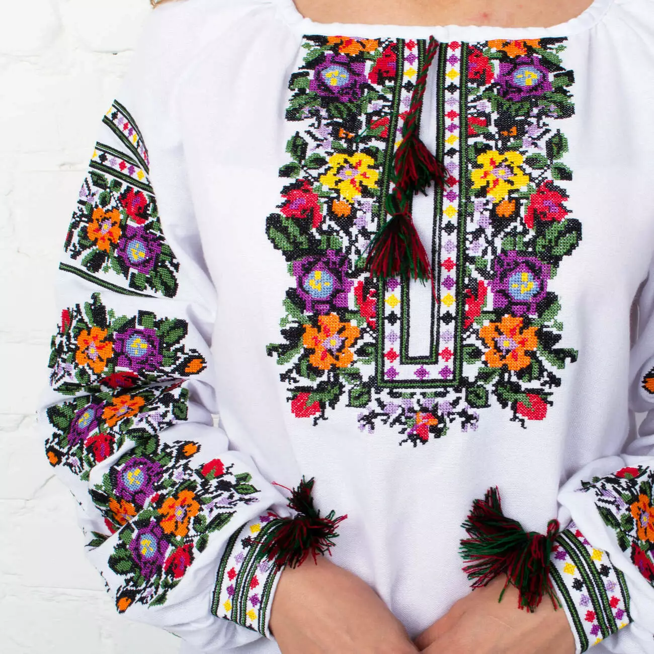 Жіноча вишиванка вишита яскравими кольоровими нитками на білій делікатній тканині від гуртівні Leosouvenir має багатий та святковий вигляд. Витончений візерунок, що прикрашає вишиванку, зробить Вас вишуканою Українкою.