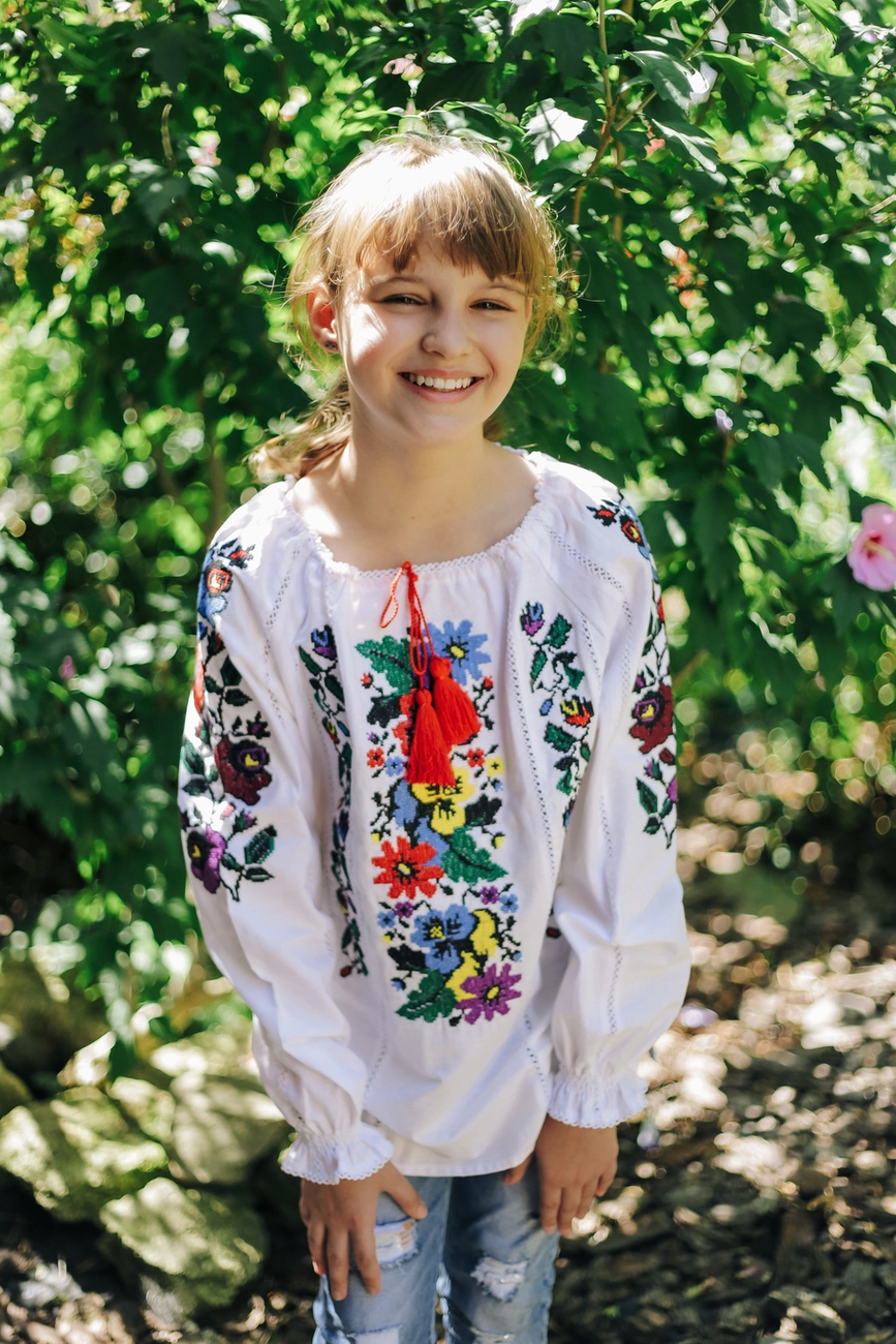 Дитяча вишиванка виконана кольоровими нитками, які чудово контрастують із білою тканиною від гуртівні Leosouvenir має багатий та святковий вигляд.