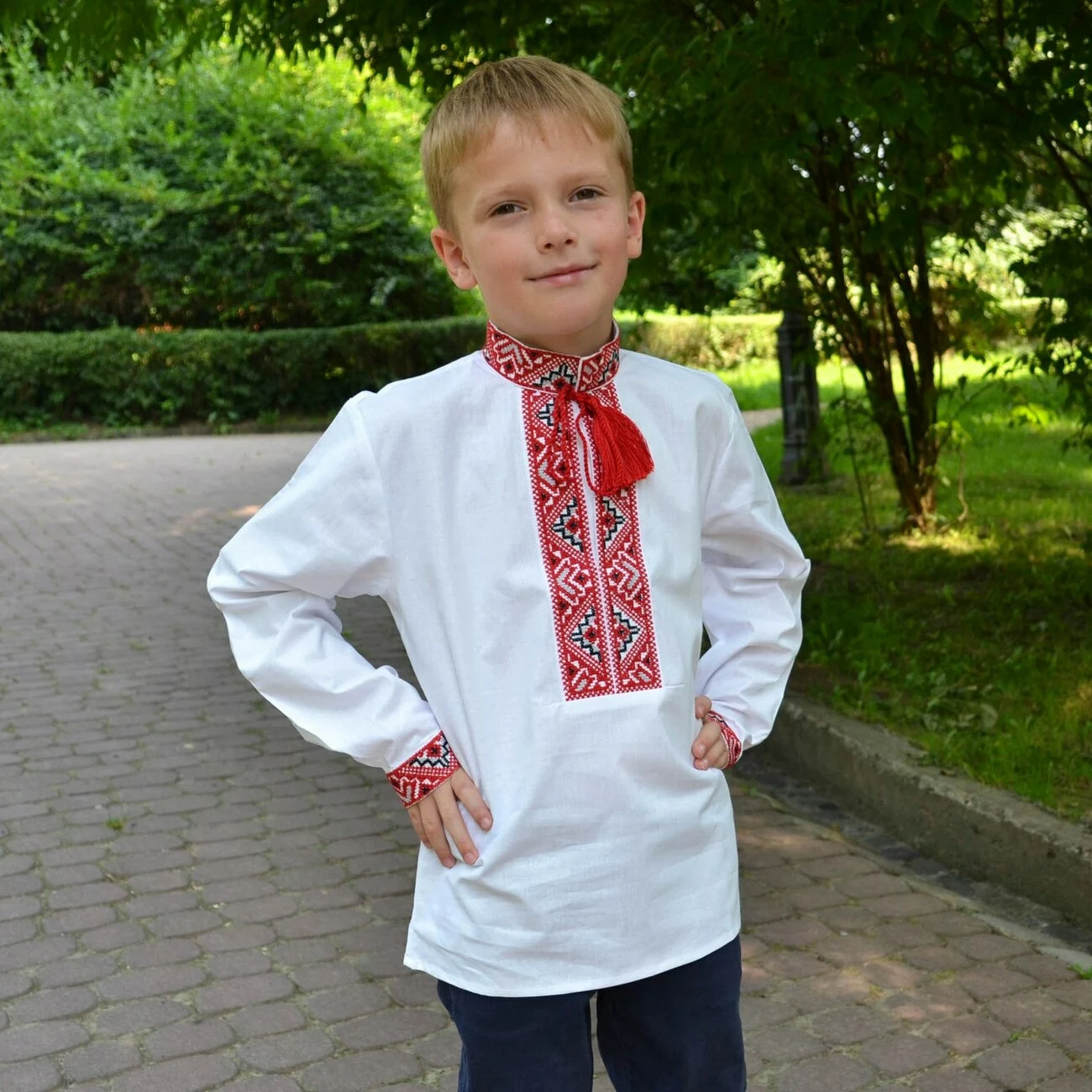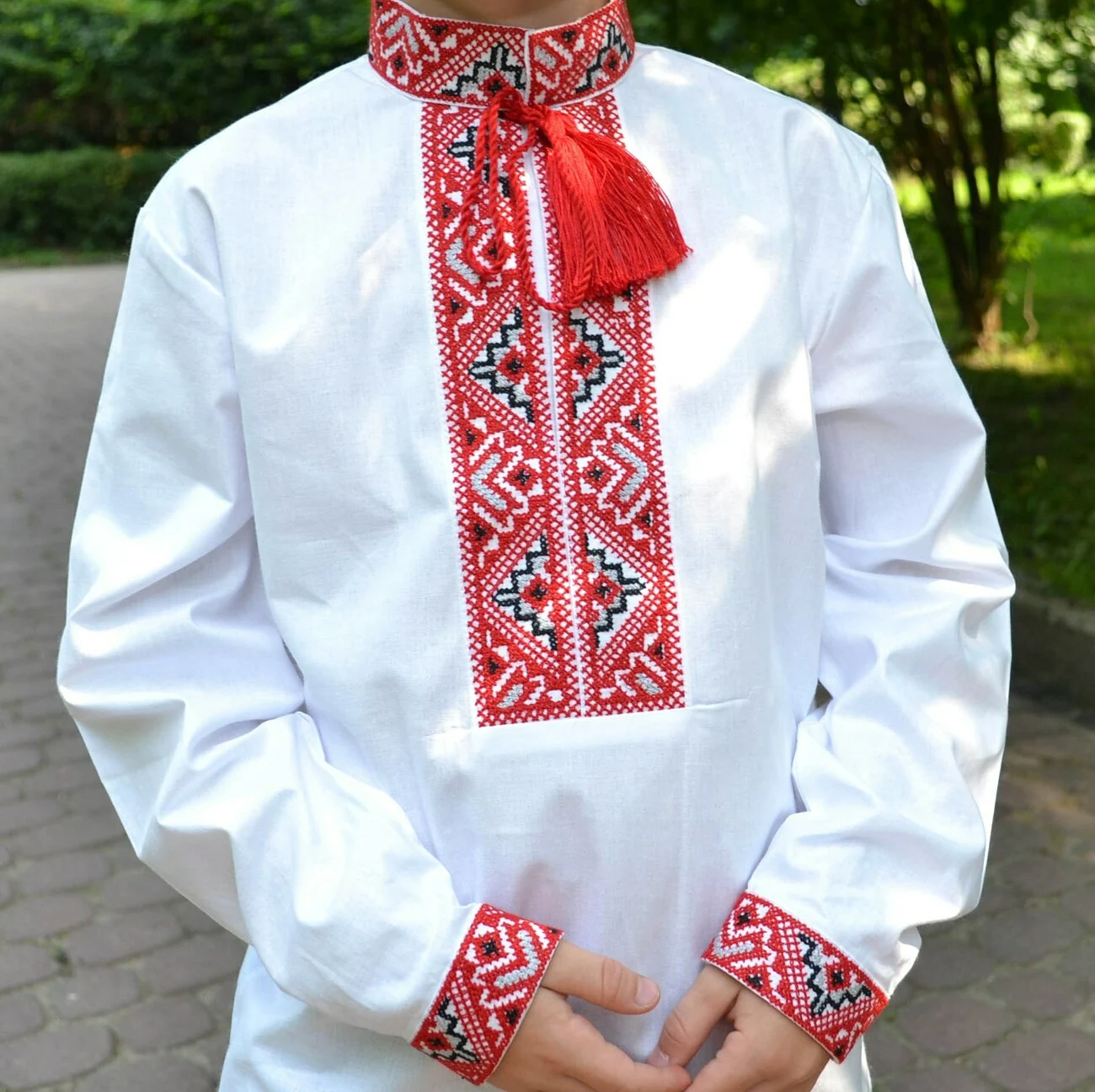 В серці вишиванки – багатий орнамент, виконаний нитками червоно-сірих кольорів. Вдале поєднання кольорів створює унікальний вигляд, завдяки чому вишиванка від гуртівні Leosouvenir має багатий та святковий вигляд.