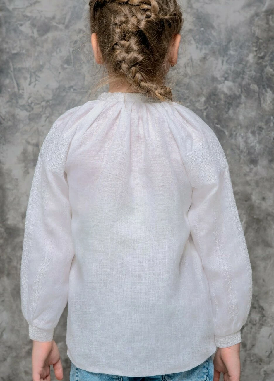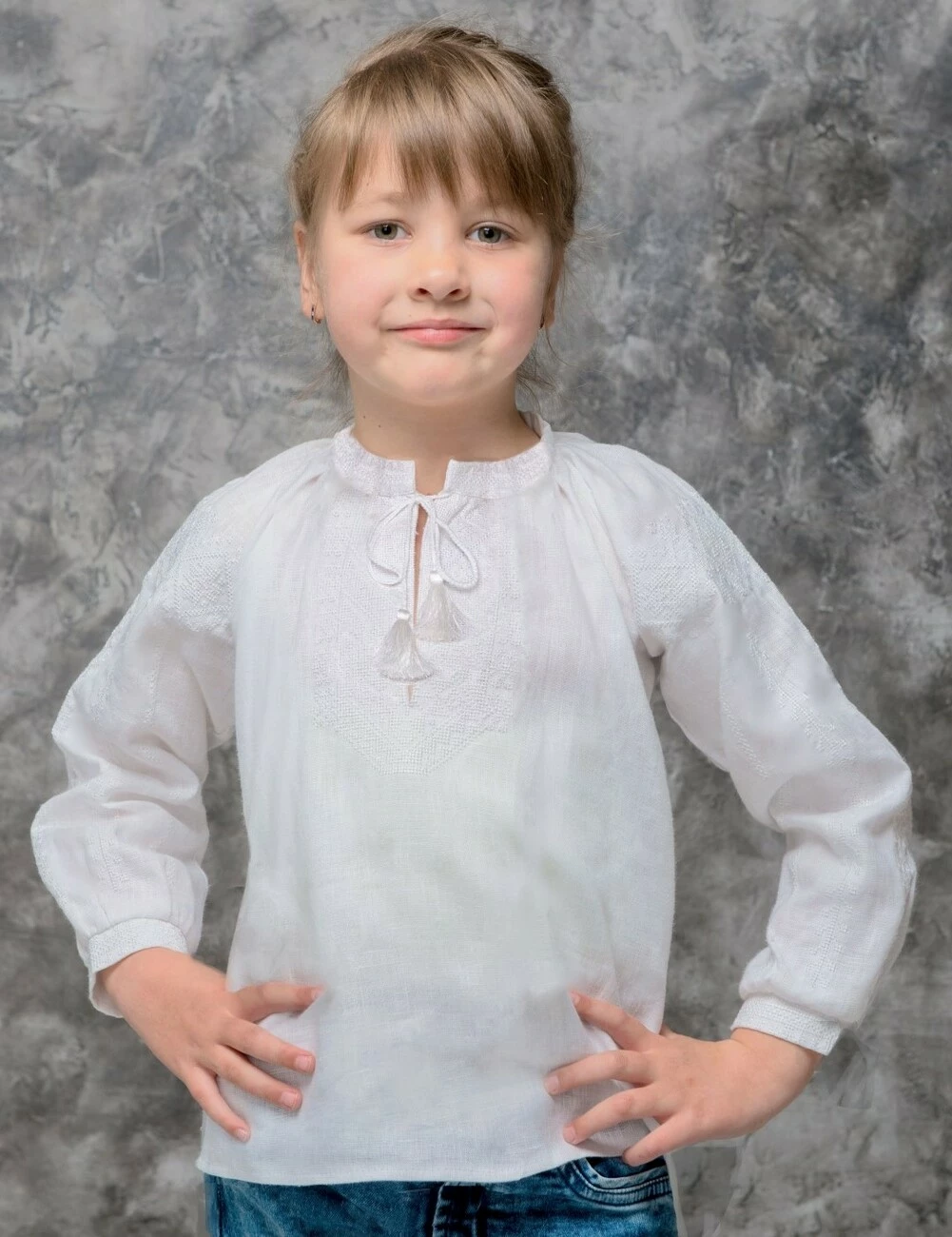 Дитяча вишиванка виконана білими нитками, які чудово контрастують із білою лляною тканиною від гуртівні Leosouvenir має багатий та святковий вигляд.
