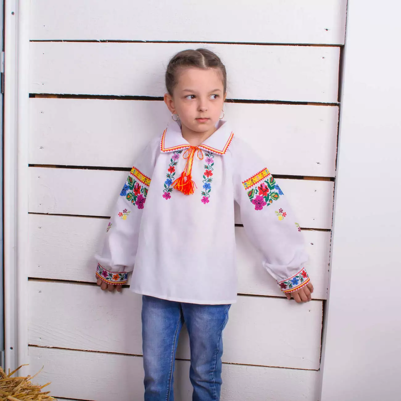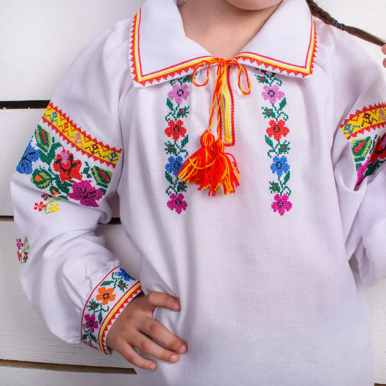 Дитяча вишиванка з комірцем виконана нитками різних яскравих кольорів, які чудово контрастують із білою тканиною, від гуртівні Leosouvenir має багатий та святковий вигляд.
