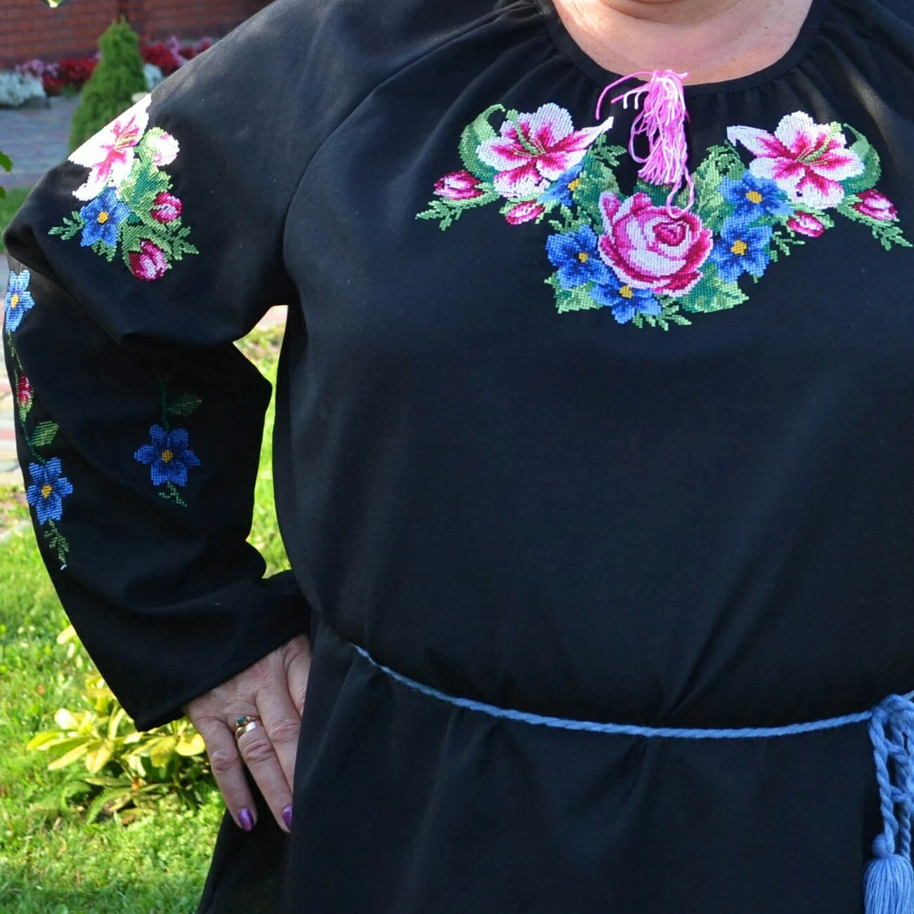 Жіноча вишиванка вишита яскравими кольоровими нитками на чорному домотканому полотні від гуртівні Leosouvenir має багатий та святковий вигляд. Витончений візерунок, що прикрашає вишиванку, зробить Вас вишуканою Українкою.