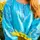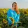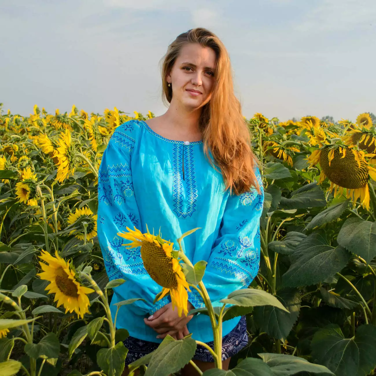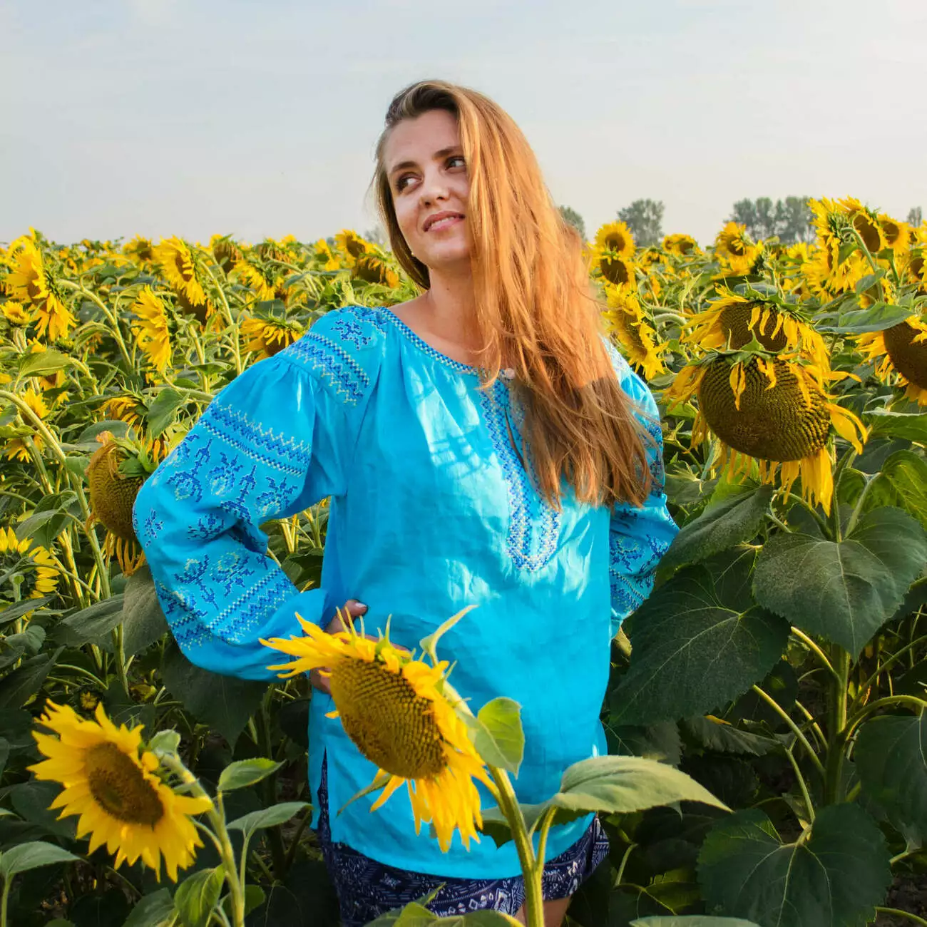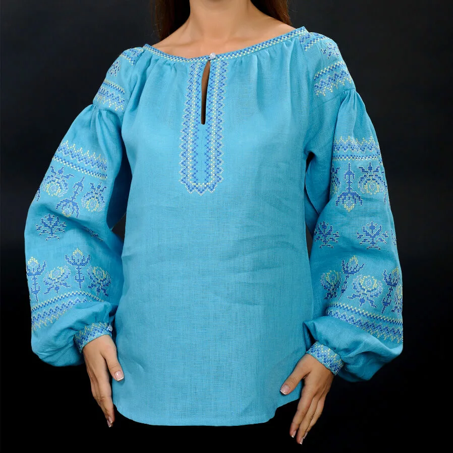 Жіноча вишиванка, вишита яскравими синьо-жовтими нитками на блакитній тканині, від гуртівні Leosouvenir має багатий та святковий вигляд.