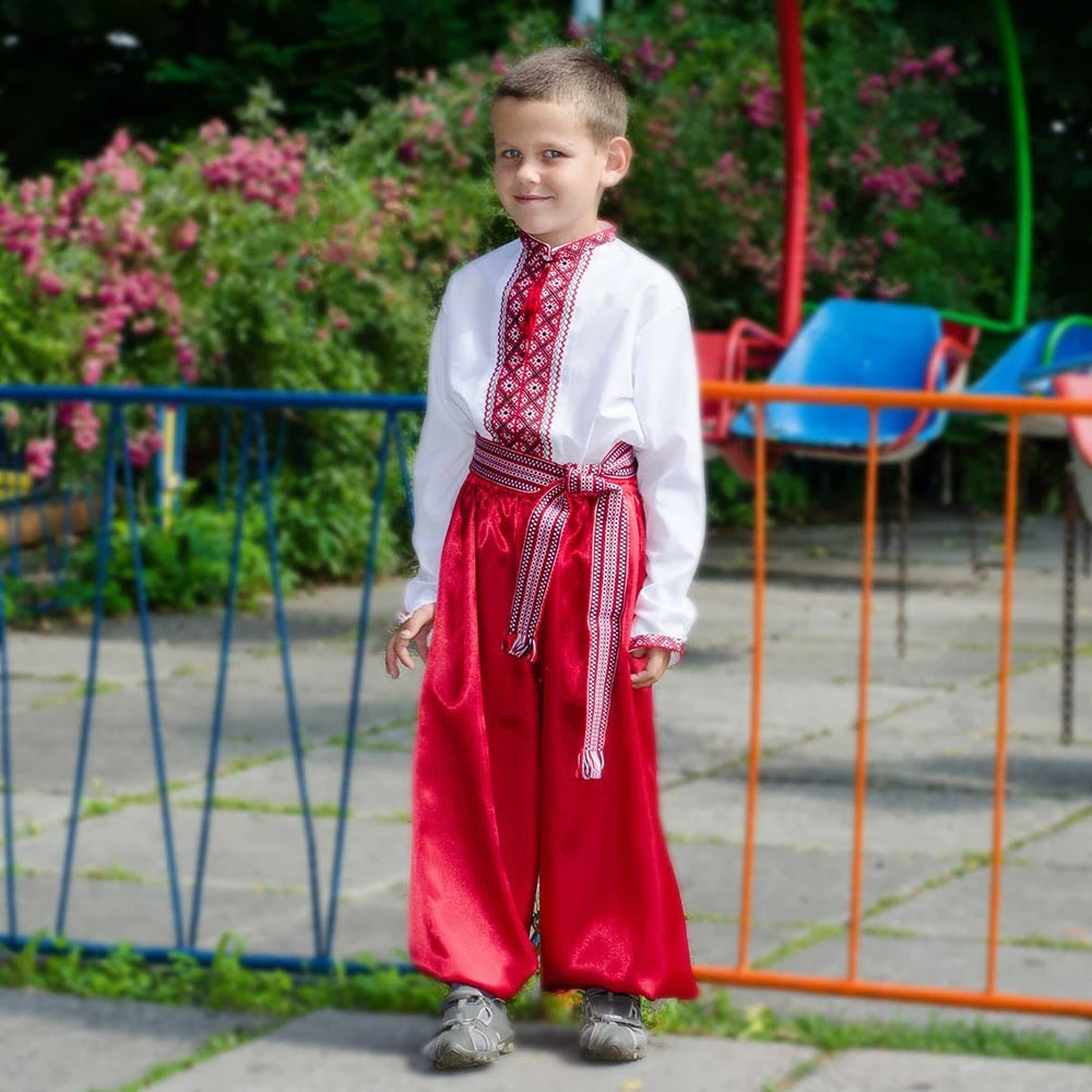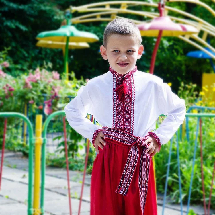 Дитяча вишита сорочка від гуртівні Leosouvenir, ідеально виконана на делікатному батисті, прикрашена традиційною вишивкою нитками червоних кольорів.