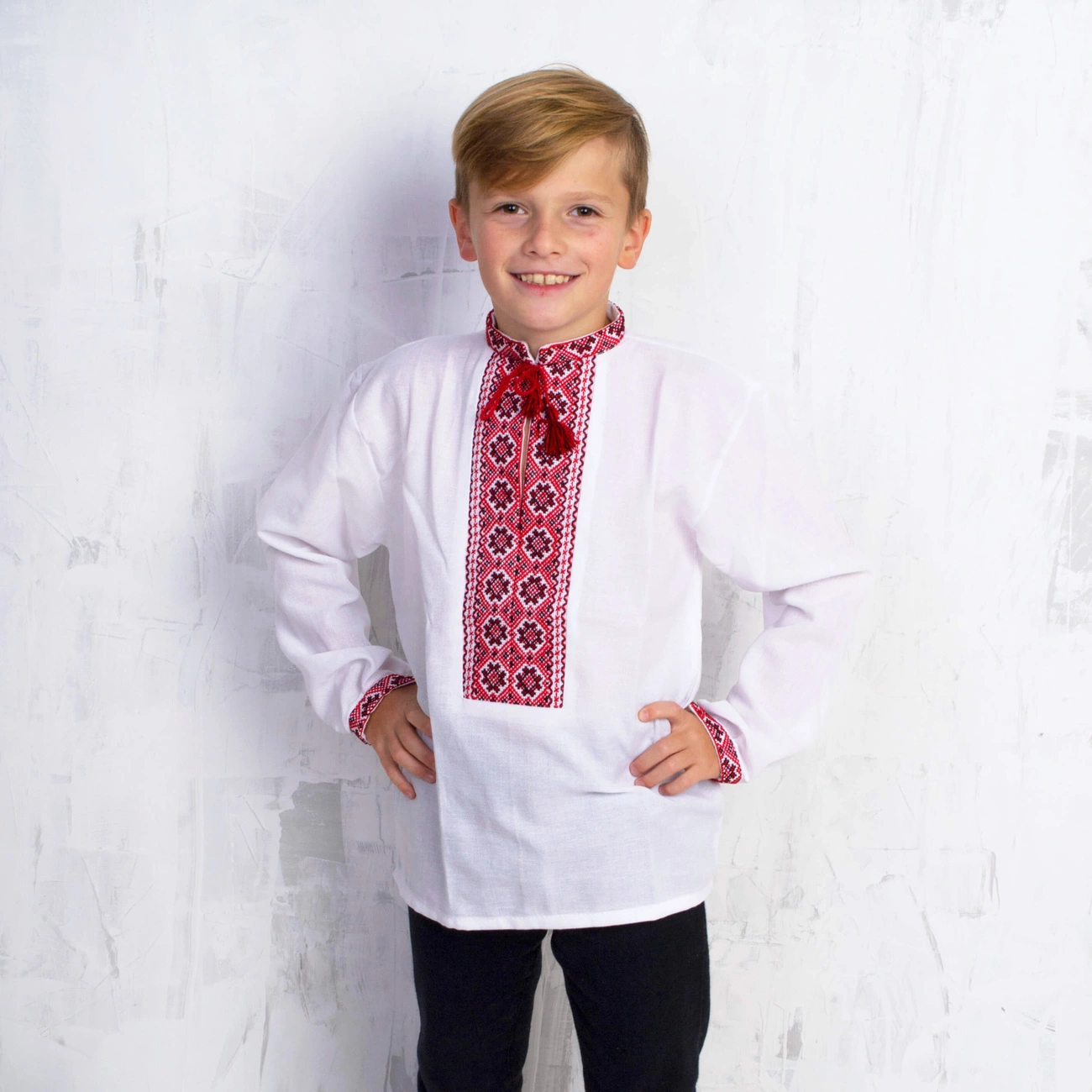 Дитяча вишита сорочка від гуртівні Leosouvenir, ідеально виконана на делікатному полотні, прикрашена традиційною вишивкою нитками червоно-чорних кольорів.
