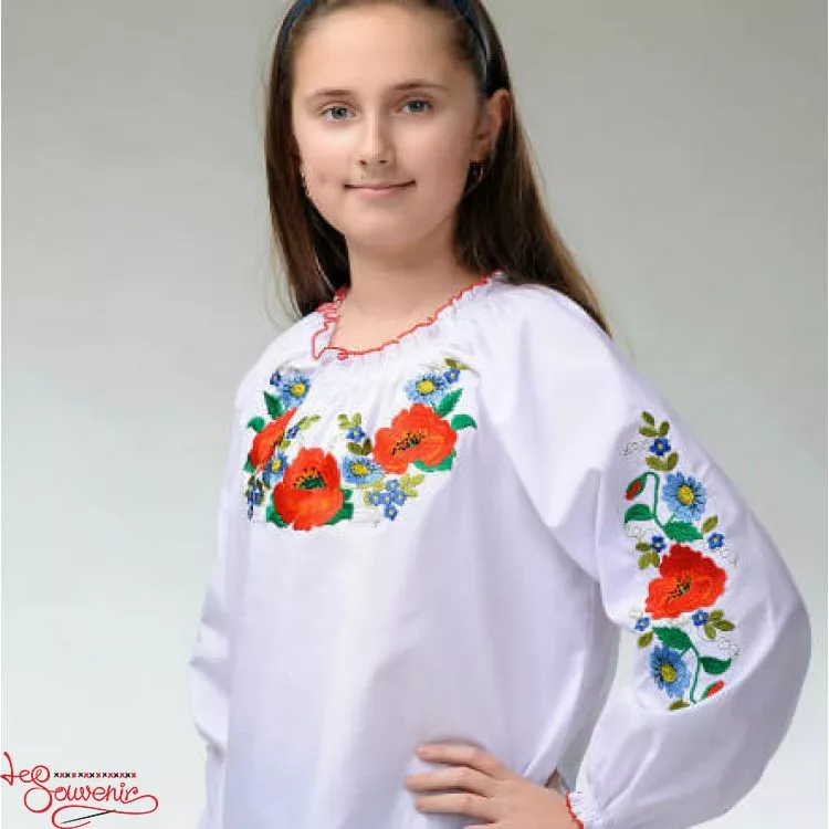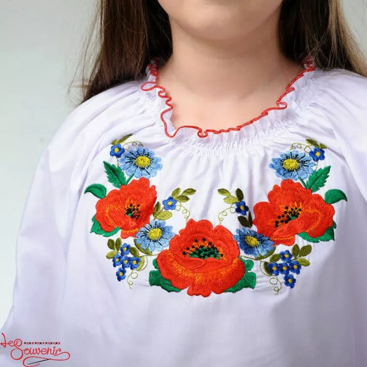 Дитяча вишиванка виконана нитками яскравих кольорів, які чудово контрастують із білою тканиною, від гуртівні Leosouvenir має багатий та святковий вигляд.