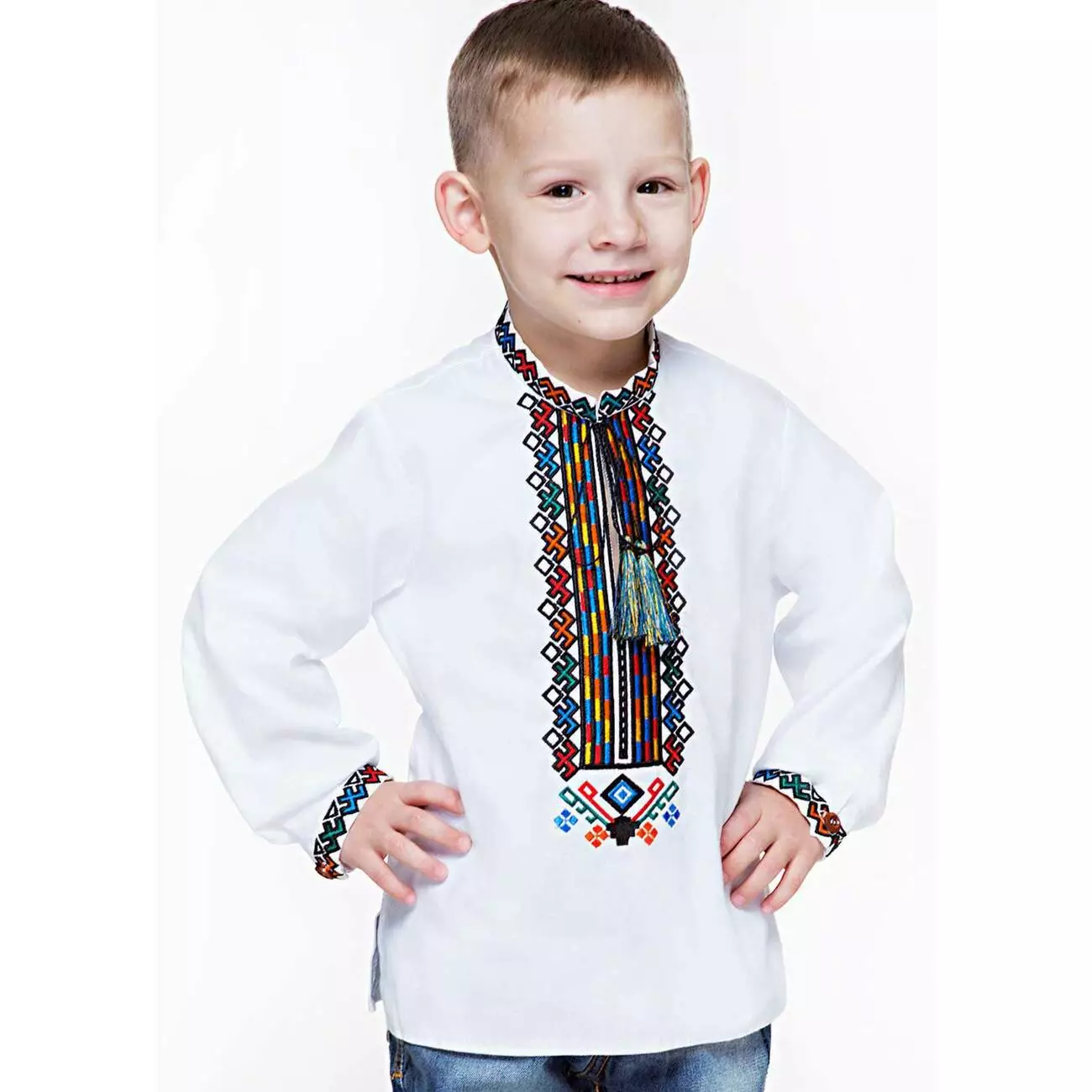 Дитяча вишиванка виконана кольоровими нитками, які чудово контрастують із білим домотканим полотном від гуртівні Leosouvenir має багатий та святковий вигляд.