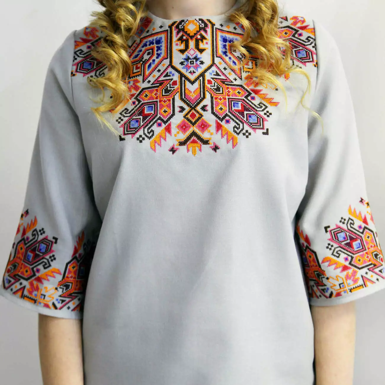 Жіноча стильна вишиванка виконана яскравими нитками, які чудово контрастують із делікатною сірою тканиною, від гуртівні Leosouvenir має багатий та святковий вигляд.
