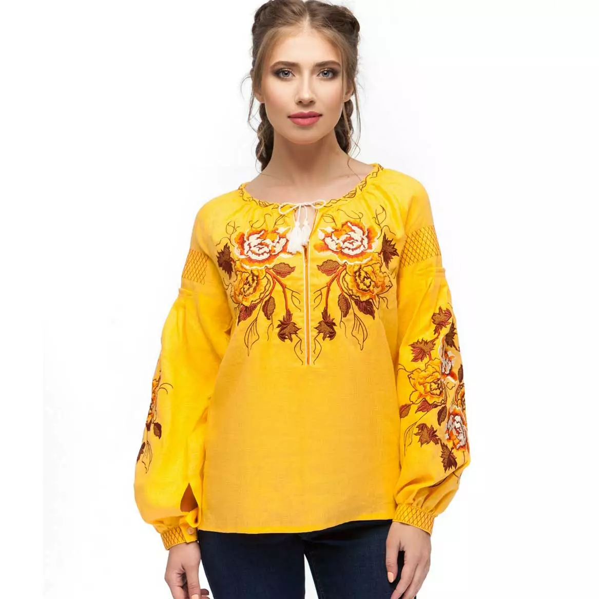 Жіноча стильна вишиванка виконана яскравими нитками, які чудово контрастують із делікатною жовтою тканиною, від гуртівні Leosouvenir має багатий та святковий вигляд.