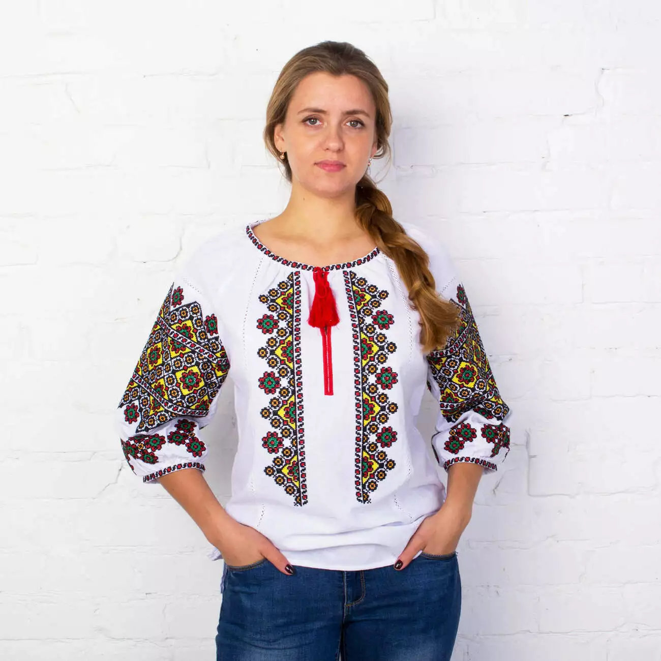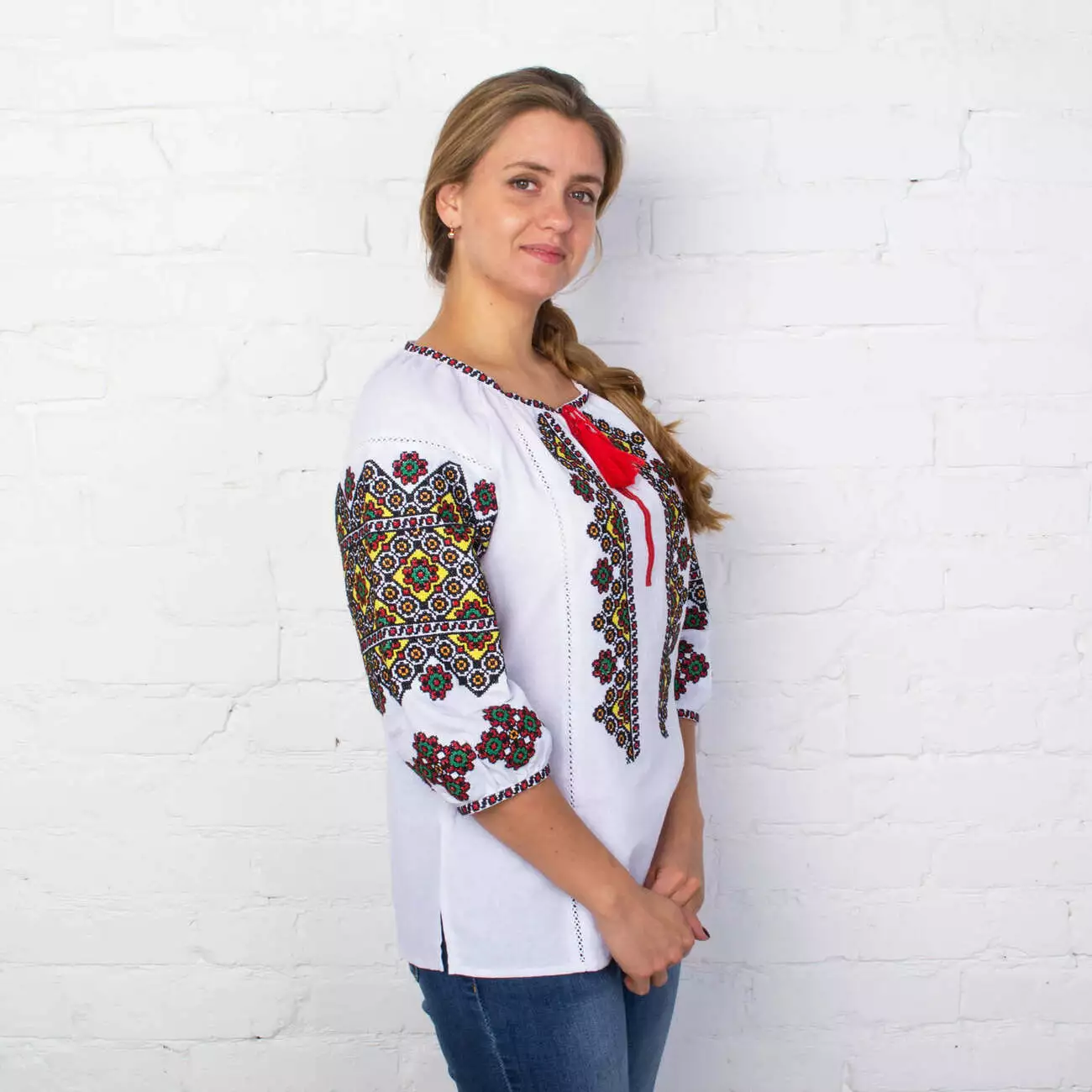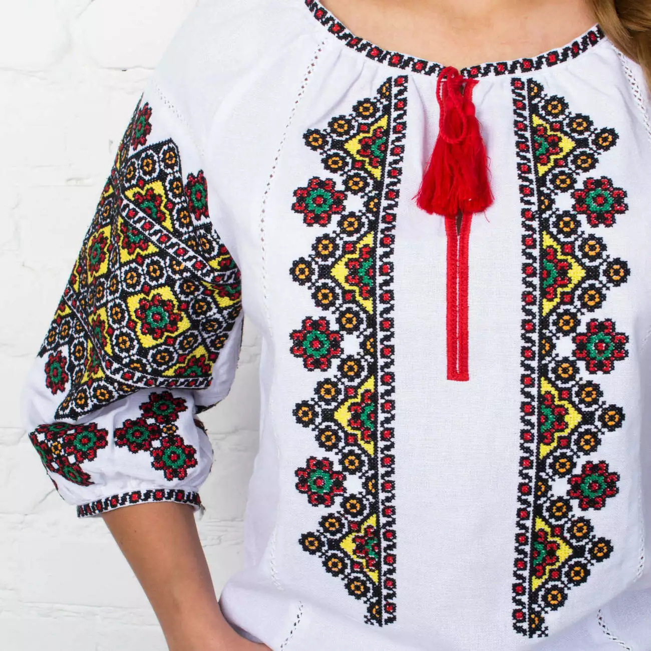 Жіноча вишиванка вишита яскравими кольоровими нитками на білій делікатній тканині від гуртівні Leosouvenir має багатий та святковий вигляд. Витончений візерунок, що прикрашає вишиванку, зробить Вас вишуканою Українкою.